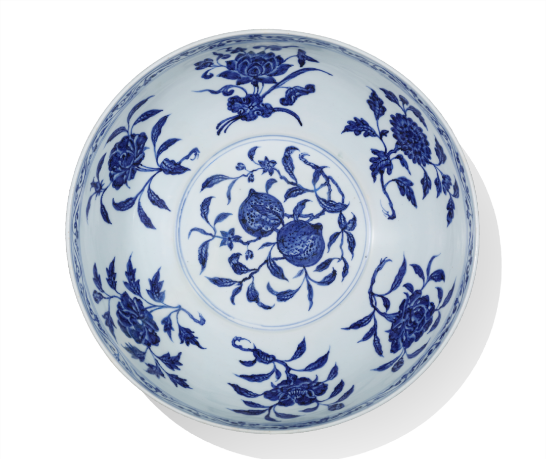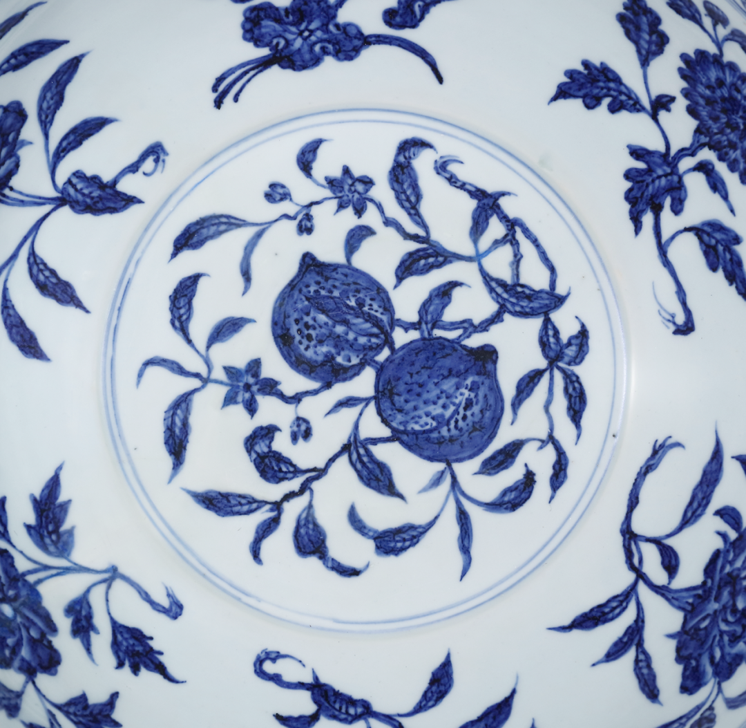 明永乐 青花折枝花卉寿桃墩式大碗(碗心局部)