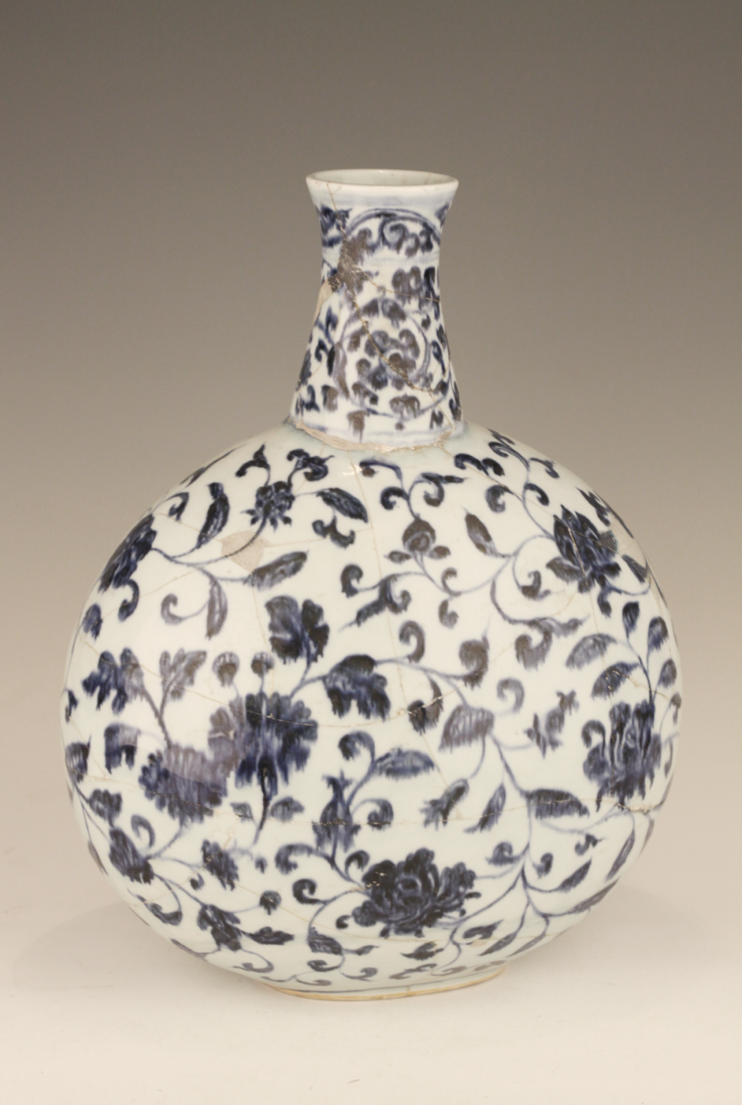 直口,长颈,扁圆腹,椭圆形圈足,底刷釉。内外施釉,外壁青花装饰。口沿饰卷草,颈饰缠枝花卉。壶身饰缠枝四季花卉。