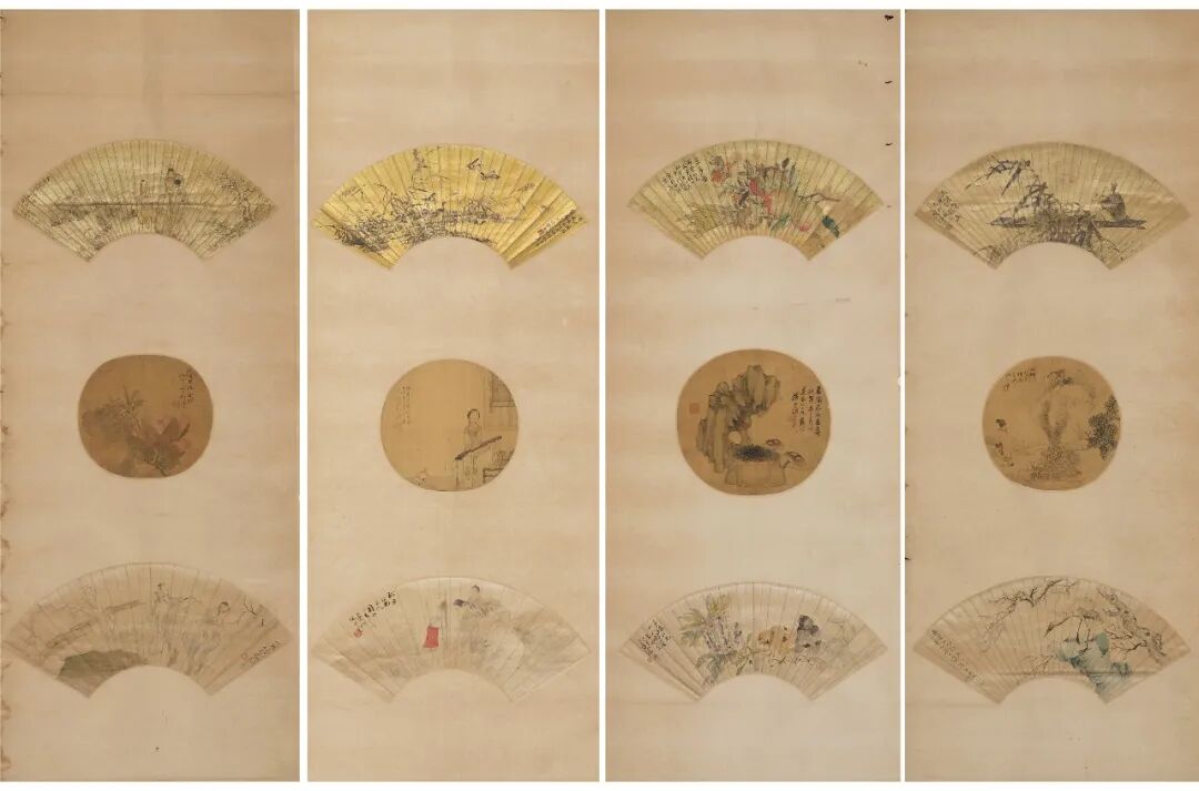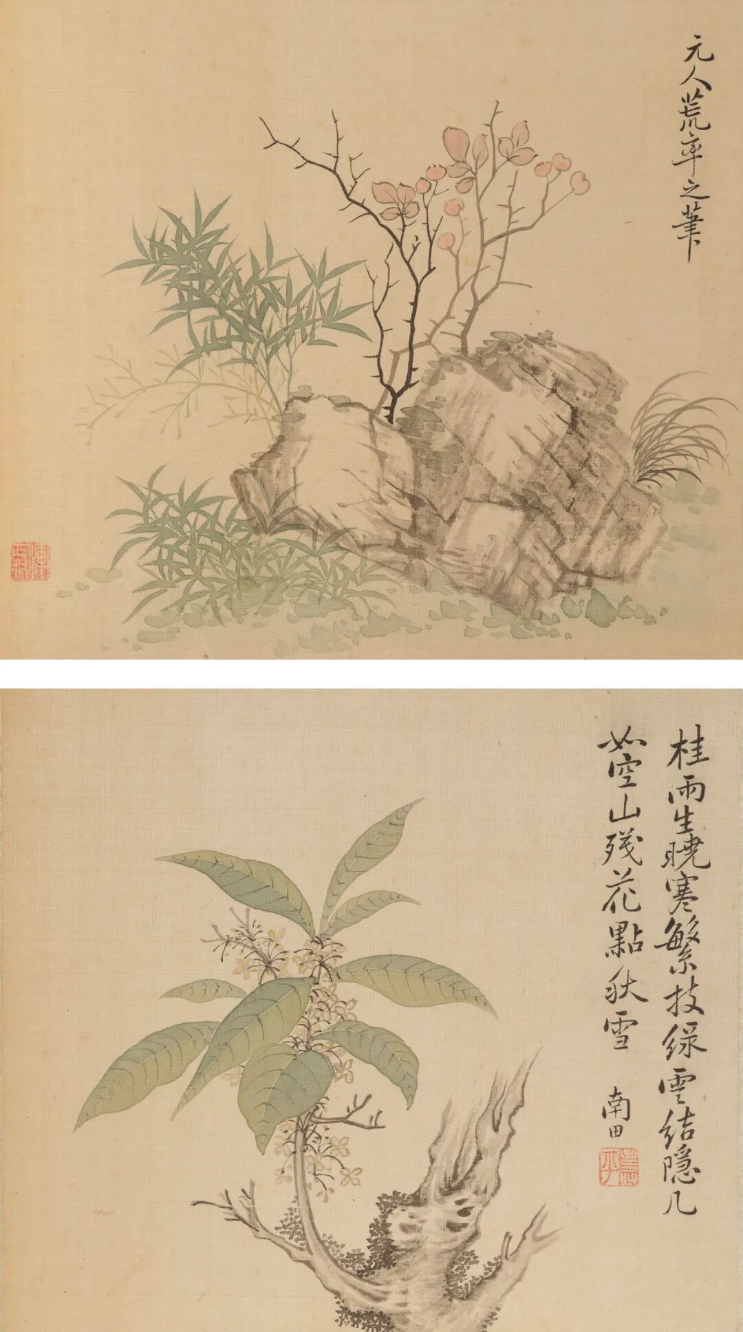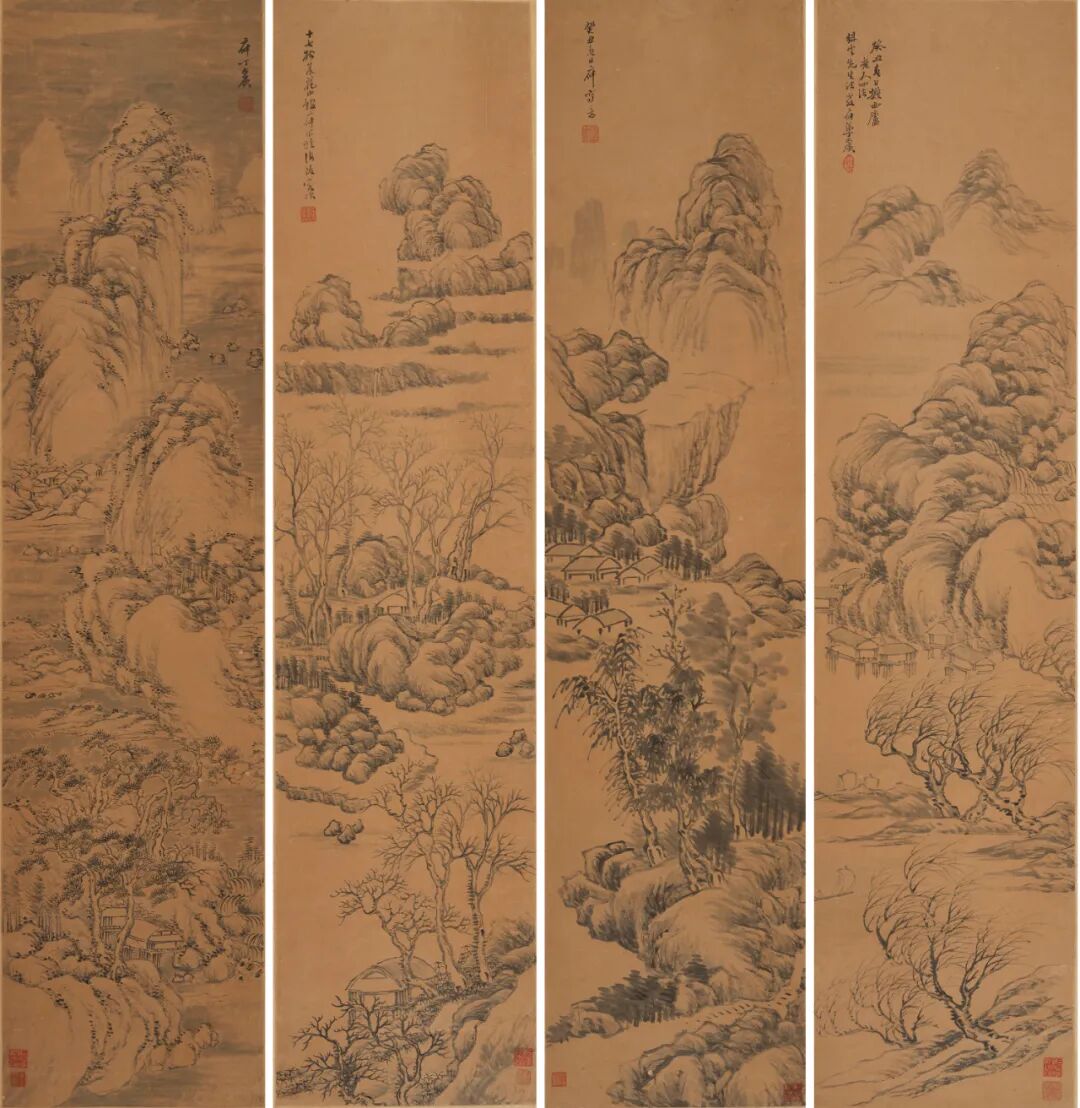 作者简介:冯仙湜,一名湜,字沚鉴,号过登,又号耶溪墨侠;康熙、雍正、乾隆间山阴(今浙江绍兴)人。善山水,师郭熙,为武林派入室弟子。款识:1. 元人荒率之笔。钤印:恽正叔。2. 桂雨生晓寒,繁枝绿云结。隐几如空山,残花点秋雪。南田。作者简介:恽寿平,原名格,字惟大,后改字寿平,更字正叔,或称叔子,号南田,江苏常州(武进)人。与王时敏、王鉴、王翚、王原祁、吴历齐名,被合称为“清初六大家”,或称“四王吴恽”。张熊(1803-1886)、任薰(1862-1893)等 杂画四屏款识:1. 雨苍仁兄先生亚述,己卯(1879年)夏月山阴任颐。钤印:任伯年。2. 小松仁兄大人雅属,墨畊倪田写。钤印:倪田私印。3. 雨苍仁兄雅属即正,辛巳(1881年)春日,苹溪外史沙馥。钤印:山春。4. 桃源问津。己亥(1899年)秋仲,仿新罗山人笔为国祯一兄大人雅属,心海沈兆涵。钤印:心海。5. 同治甲戌春杪,伯年写于海上。钤印:颐印。6. 心颜二兄大人雅属,阜长任薰写于吴门。钤印:任薰。7. 三多图。雨苍仁兄夫子雅正,乙亥(1875年)冬十月,子祥张熊写于申江寓斋。钤印:张熊私印。8. 菖蒲卷石益寿延年,辛巳(1881年)夏似遂承仁大兄属正,横云胡公寿。钤印:公寿、公寿长寿9. 子瑞仁兄大人雅鉴,辛卯(1891年)夏六月,小仓徐祥。钤印:徐祥之印。10. 平沙落雁。戊辰(1868年)秋七月,仿陆叔平本,维乔仁兄大人雅之属,子祥张熊。11. 疏帘清簟终朝静,只有琴书可自亲。戊寅(1878年)夏六月,拟玉壶外史,清溪樵子钱慧安。钤印:吉生。12. 松丞仁兄大人雅正,己亥(1899年)午月,墨畊倪田写。钤印:墨耕。作者简介:1. 任伯年,名颐,后改伯年,号小楼,山阴(今浙江绍兴)人。鹤声子。初随父学画,后又随其族叔任熊、任熏习画,并开始卖画为生。为人真率不修边幅。其肖像、人物、花鸟、山水无所不能,工笔设色、水墨、写意无所不精。人物、花鸟仿宋人双勾法,赋色浓厚,白描传神,颇近陈洪绶。书法亦参画意,奇警异常。与胡公寿并重。是清末海上最杰出的画家之一,与任熊、任熏并称为海上“三任”。2. 张熊,字子祥,别号鸳湖外史,秀水(今浙江嘉兴)人,流寓上海。工花卉,纵逸似周之冕,古媚似王武。尤擅大幅牡丹,屏山巨幛,以寻丈计者愈见力量。兼作人物、山水,精篆刻,八分乃其余技。平生收藏金石书画甚富,颜所居曰银藤花馆。着有题画记。卒年八十四。妻钟惠珠别有传。