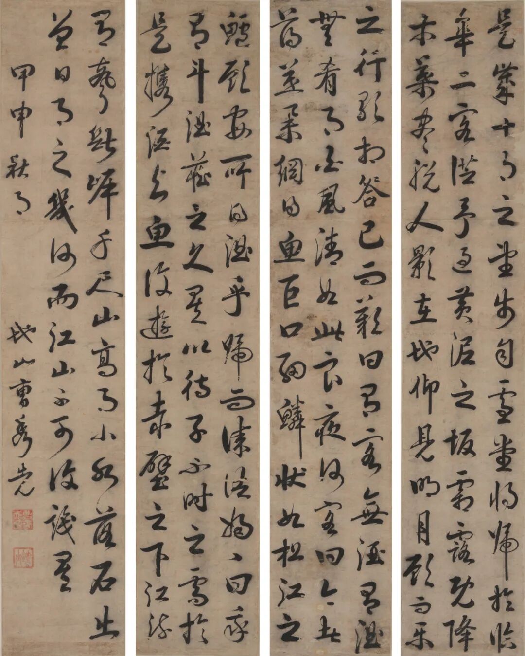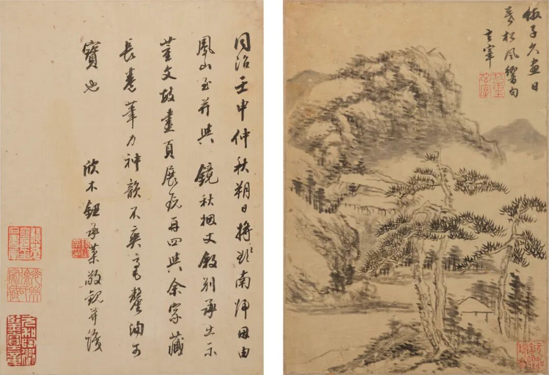 款识:1. 癸丑 (1913) 春日拟西庐老人四法,组云先生法教,二仲弟丁尚庾。钤印:庾、学痴。2. 癸丑春日,二仲写意。钤印:潞河丁氏尚庾字二中金石书画之印信、咫尺应须论万里。3. 十七树梅花山馆二仲作于海陵客次。钤印:十七树梅花山馆庾印、家在燕潞之间。4. 二仲丁尚庾。钤印:庾印、丁六子。
