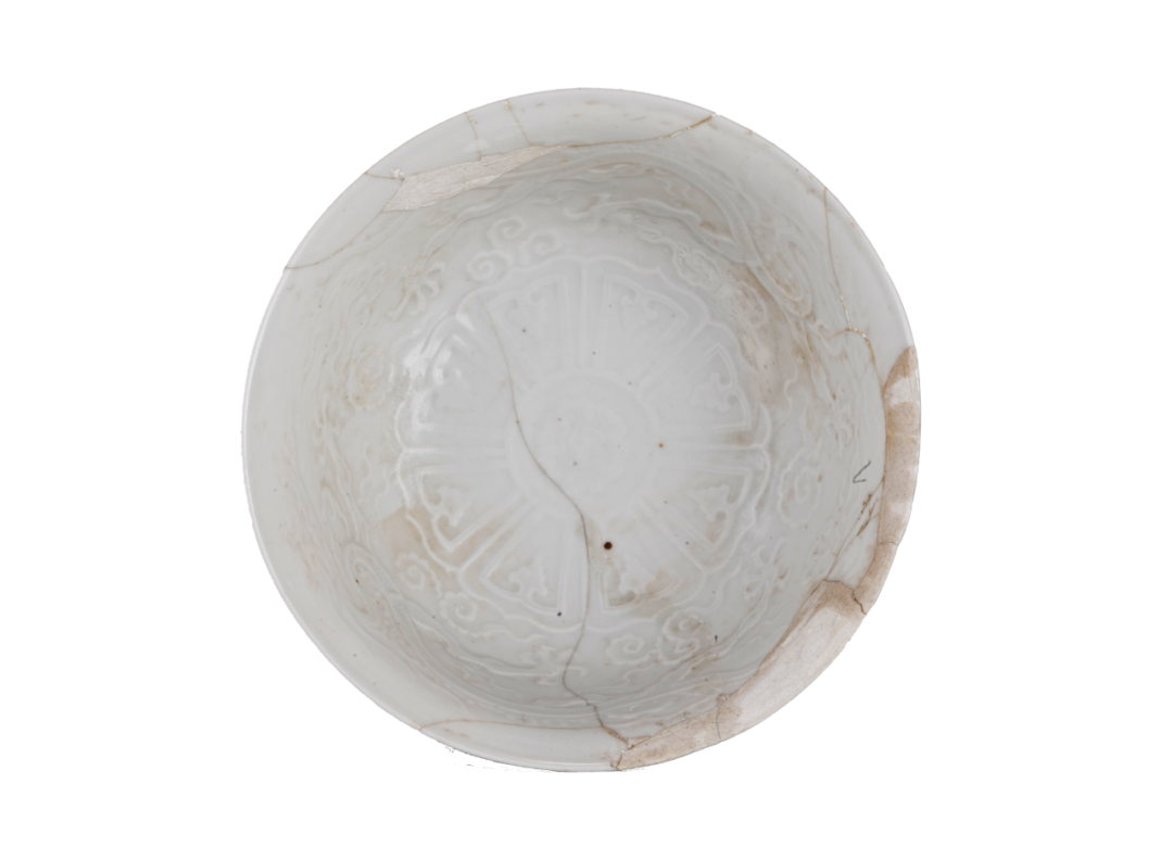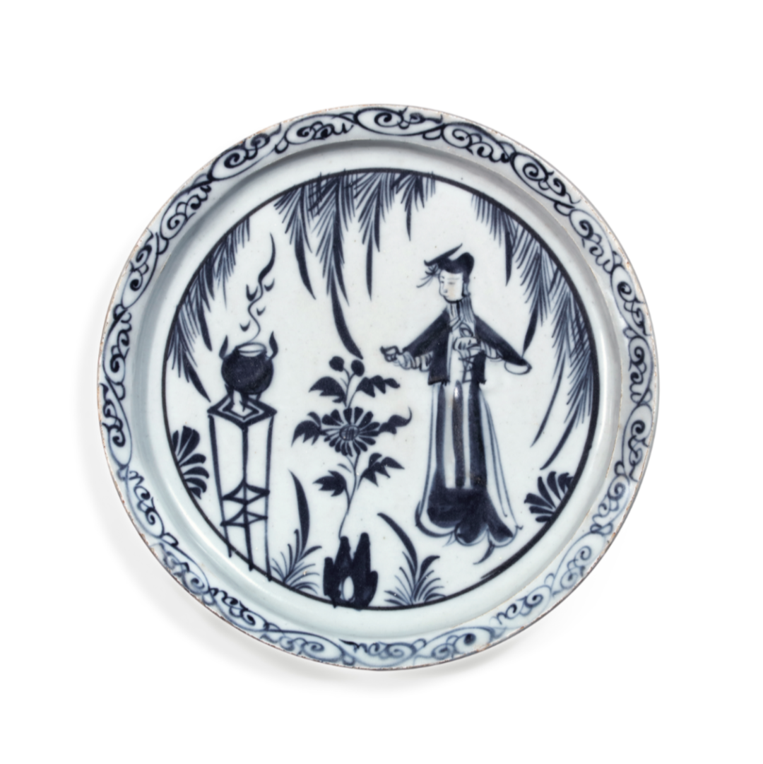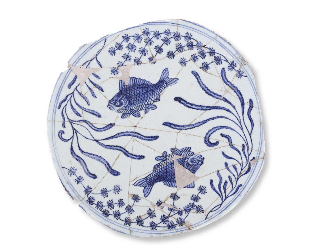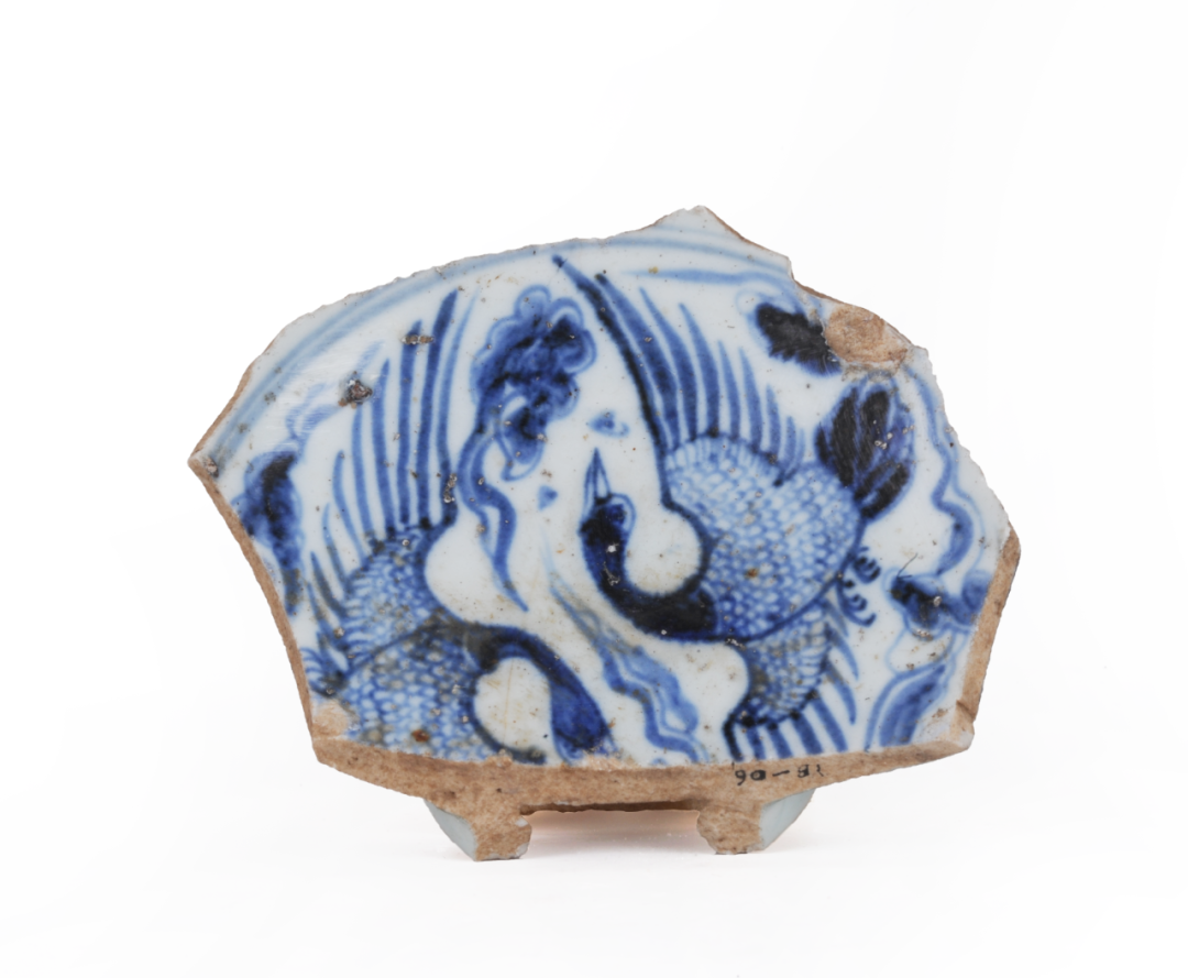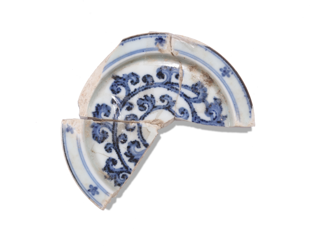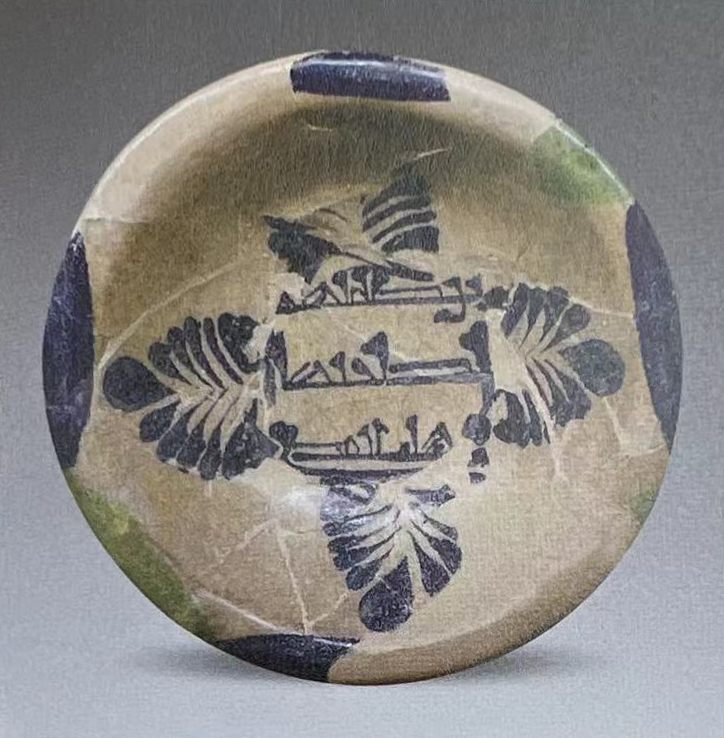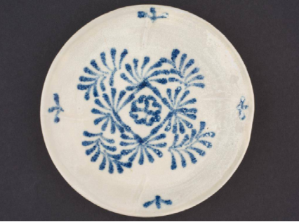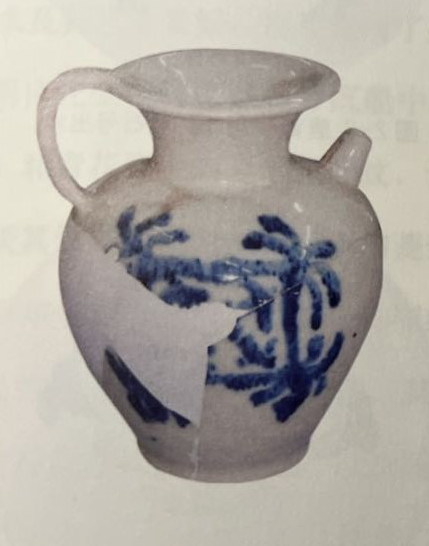 最早可追溯的青花陶瓷,可见1975年南京博物馆首次在扬州唐代地层出土的白地蓝彩瓷片,但此类器物非瓷胎而是黄白色陶胎,经测试,其胎釉成分和烧成温度与河南巩县窑唐代白瓷基本一致。之后,在河南巩县窑窑址也发现了白地蓝彩器。现可确定唐青花产地为河南巩县窑。1998年在印尼海域的沉船黑石号上打捞的器物中发现了三件白地蓝彩青花瓷盘整器,胎体具备巩县瓷土特征,青花料属低铁低锰的钴料,应为来自波斯等域外销输入。在唐代宝历年间(公元9世纪上半叶),“黑石号”满载大量瓷器等大唐货物驶向波斯湾,启航后久便沉没于印尼海域。唐代青花与波斯的文化交流密切相关,且与西亚、波斯同时期釉陶器有着极为类似的风格。这一时期的青花极大的受到伊斯兰文化的影响,“黑石号”青花盘与在扬州出土的唐青花碎片上的纹饰,以散叶夹菱形纹为代表,类似于波斯伊斯兰纹饰,充满异域风格。本次展览中的唐青花花叶纹执壶标本亦为同类风格作品。