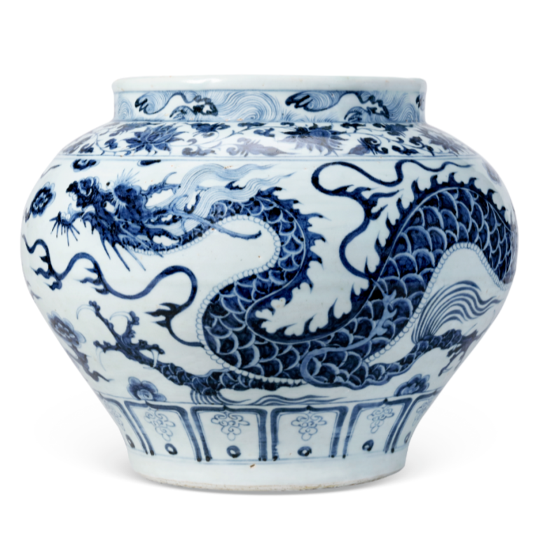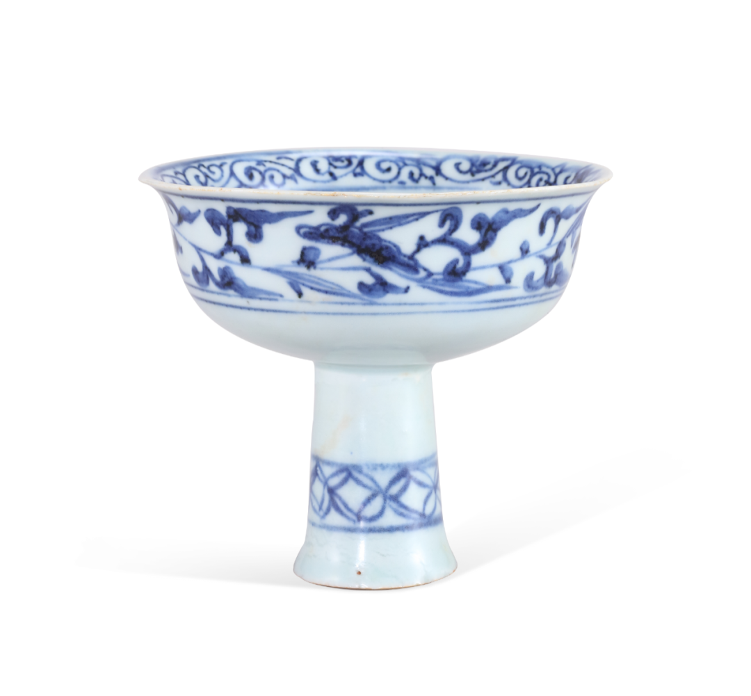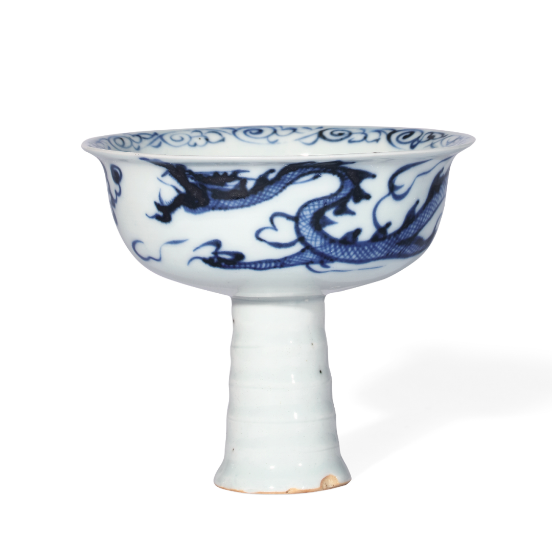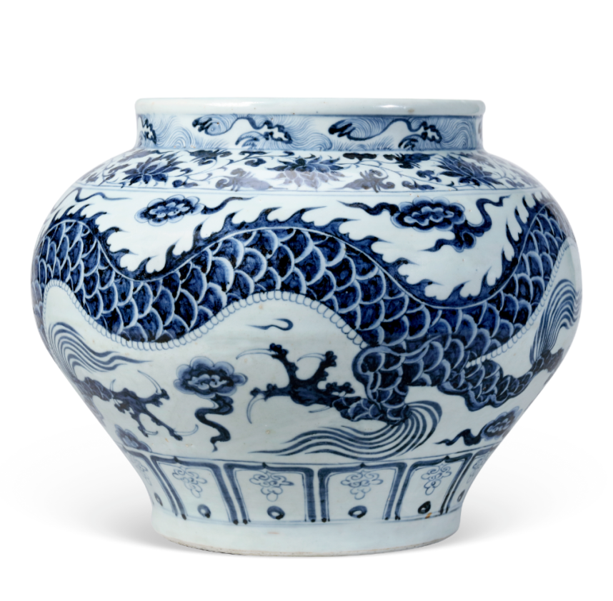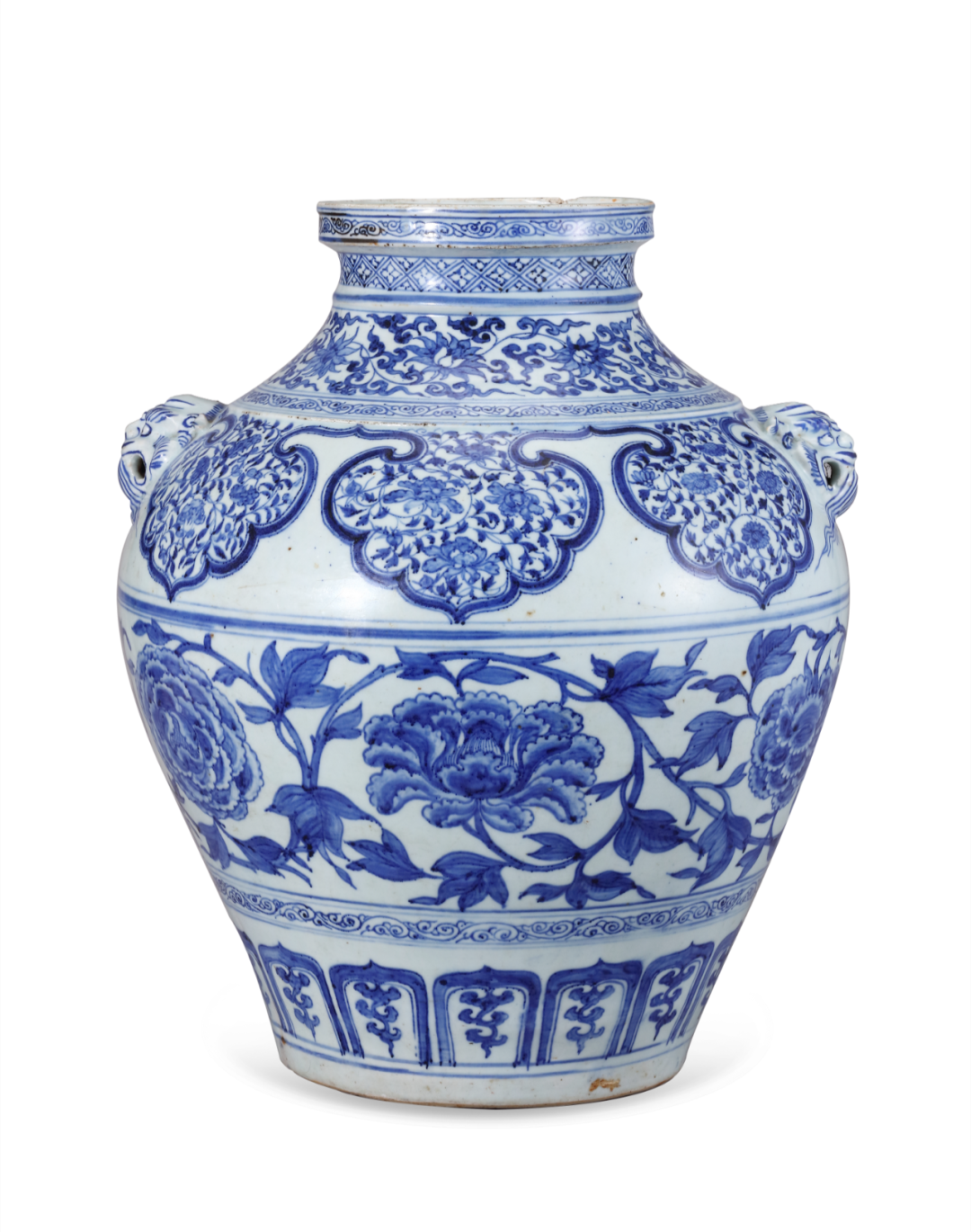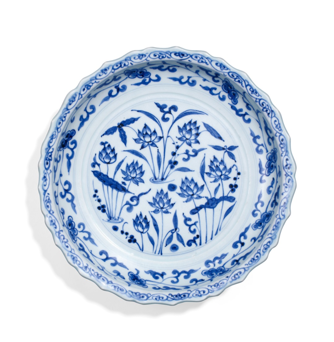 明初洪武二年朝廷在景德镇正式设立“陶厂”,建文四年(1402年)更名为“御器厂”。而御窑厂的正式创立为明代乃至清代整个中国陶瓷艺术奠定基石。这一时期青花瓷明显呈现出一种由元代青花向典型明代青花瓷过渡的特征。所用青料经分析化验,主要还是进口青料为主,不过因烧成技术所限,故多发色灰暗,亦有釉面肥润,青花深沉之作。