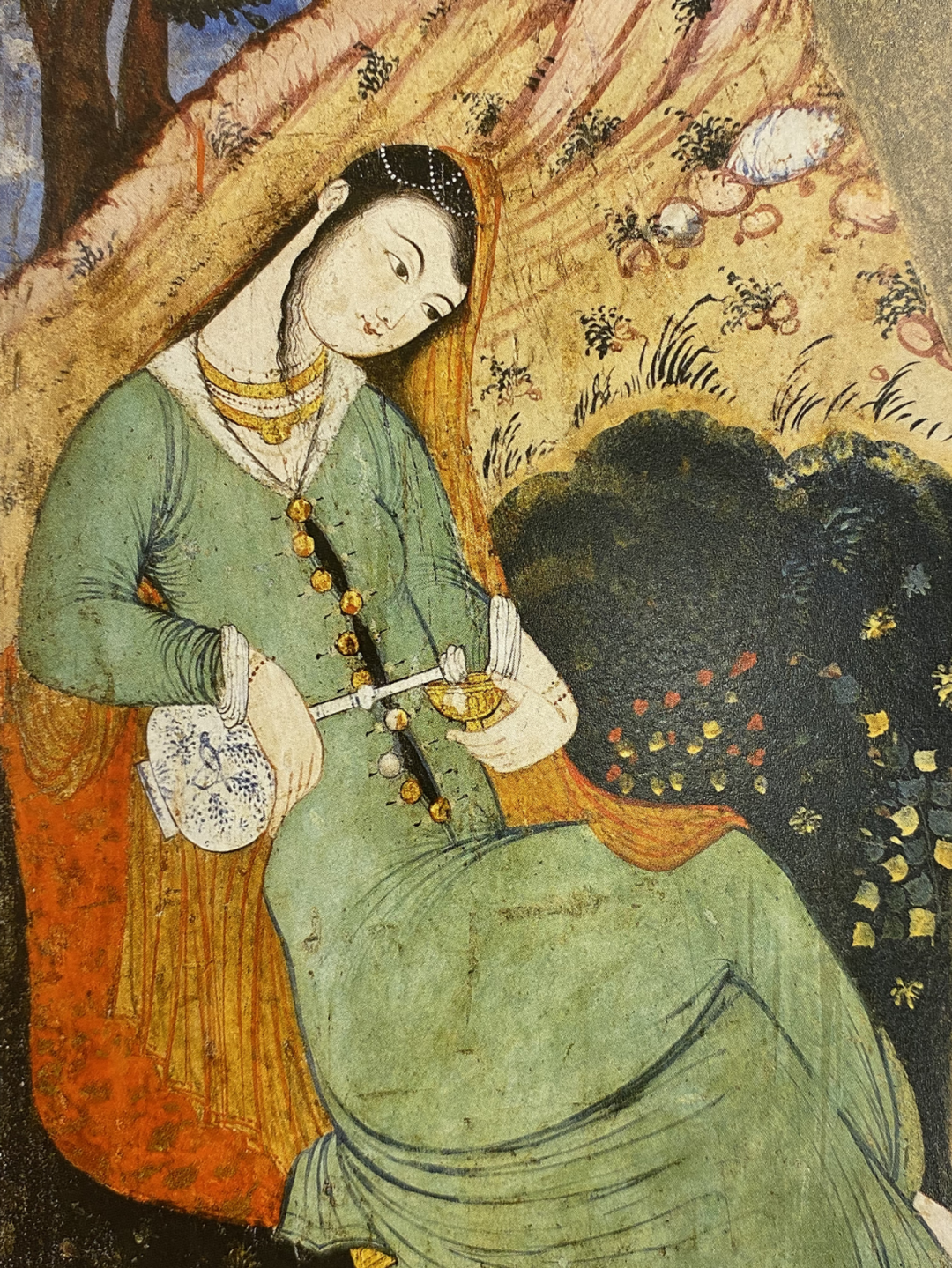 四十柱宫壁画之一:独自酌酒的绿衣女子(局部)