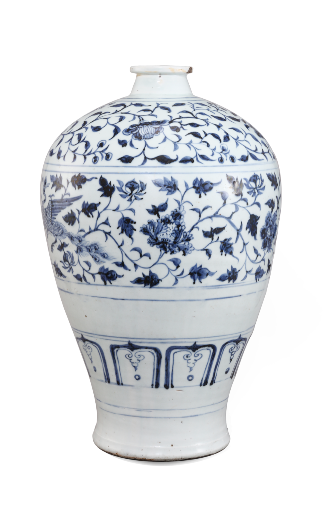 元青花造型多样,有梅瓶、玉壶春瓶、大罐、圆口或花口折沿盘、高足杯、藏草瓶、扁壶、军持、仿蒙古包等,不胜枚举。纹饰题材丰富,龙凤、人物、飞禽、走兽、草虫、花卉、几何图案等,包罗万象。其中既有对中国传统的继承,也有深受伊斯兰文化影响的模仿和创新之作。如外销西亚的元青花多见硕大的盘、碗、罐、瓶等,纹饰多层布局,满密繁复。而销往东南亚地区的则以小件器物为主,纹饰简洁疏朗。有些纹样如满池娇、蓝地白花等多借鉴于蒙古人喜爱的丝织品图案,庭院、人物、诗句等纹样明显受汉族绘画和杂曲平话的影响,可见元代青花瓷是多民族文化和技术融合的产物。