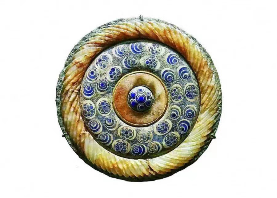 战国嵌玉嵌蜻蜓眼式玻璃铜镜