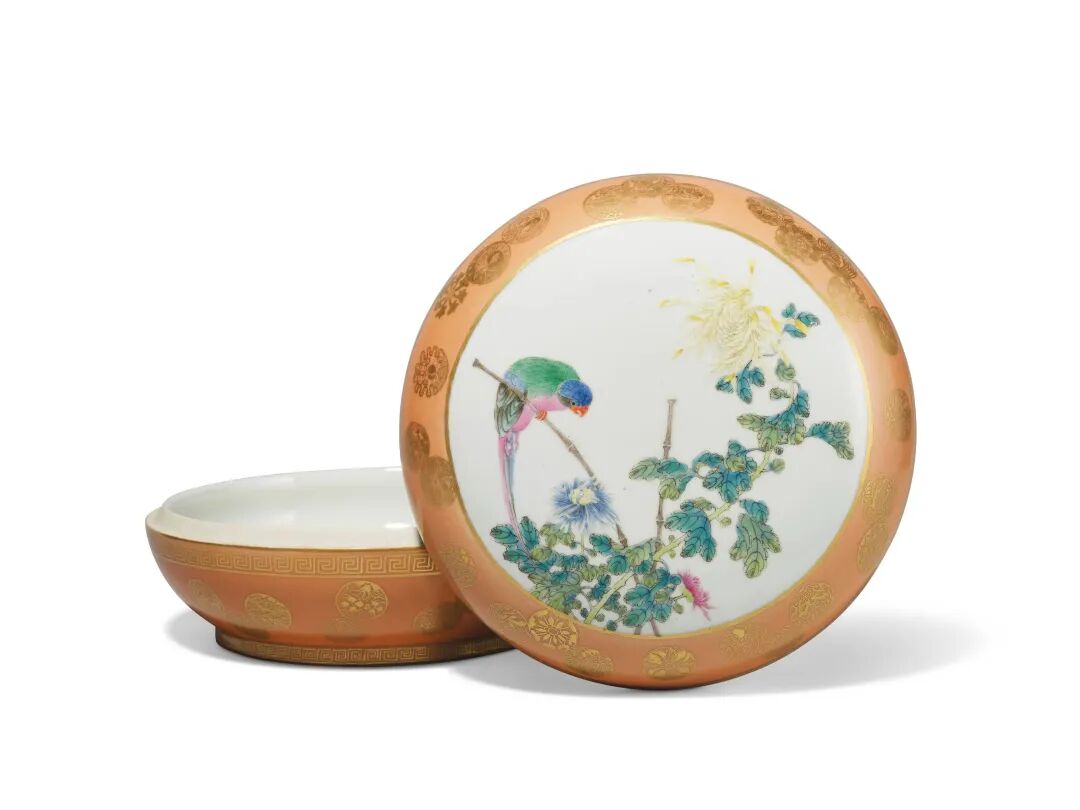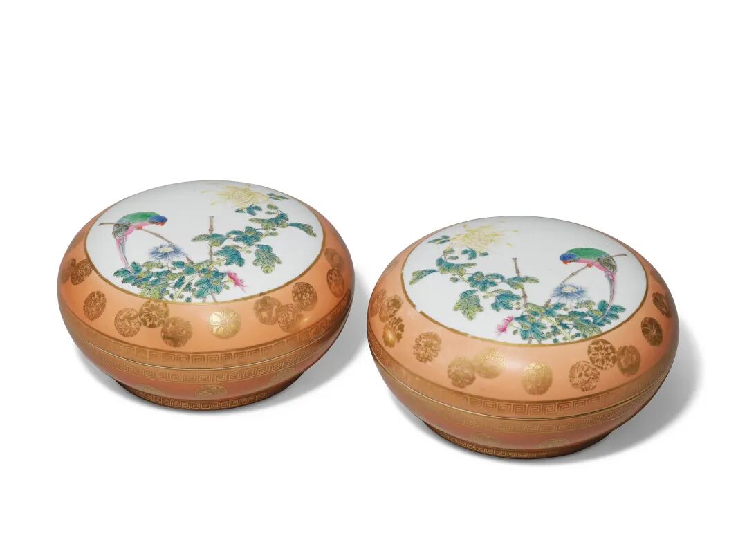 粉彩描金鹦鹉菊花纹蓋盒一对