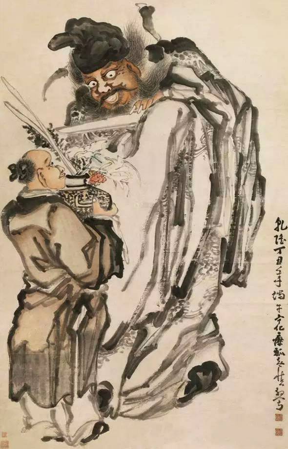 此画作中钟馗正与孩子嬉戏,他的中以及背景的花瓶中都可以看到菖蒲和艾叶。挂钟馗像,是汉族传统节日端午节的习俗。每年端午节,在江淮地区,家家都悬钟馗像,用以镇宅驱邪。