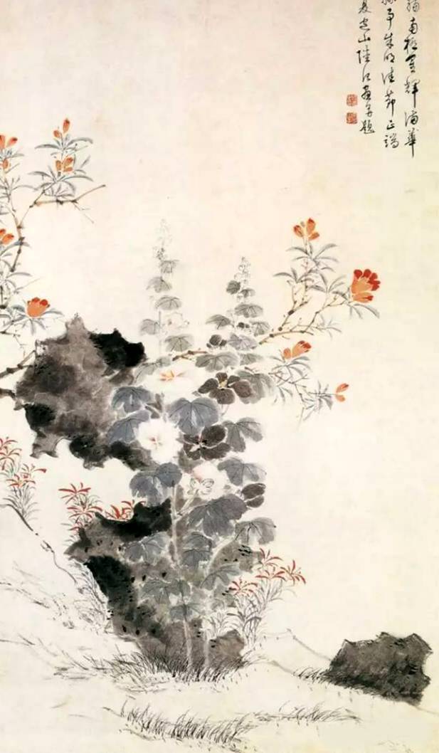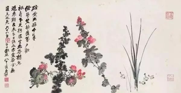 此图所画是端午节时花木的芳姿。图中的湖石是背景和衬托,故仅用淡墨干笔渲染造型,复加以苔点,颇显意趣;而萱草、蜀葵、石榴等花叶,均以勾花点叶法重点刻画,勾笔细劲如铁线,而点叶则用笔较拘谨,但温润沉着;野草灌木则直接以没骨画法用色彩点染写出,显得生趣盎然。