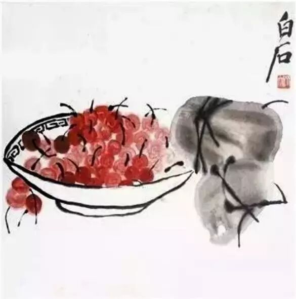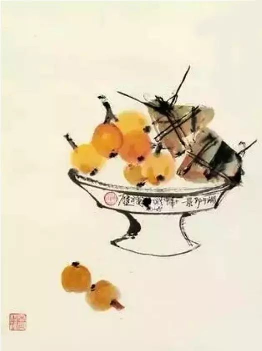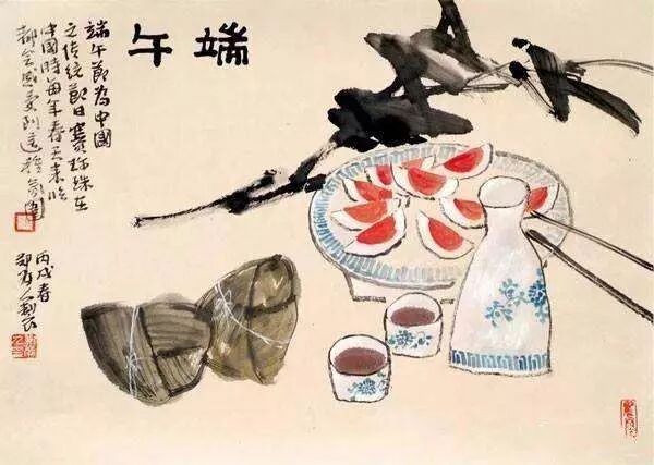 一盘红樱桃、两个粽子,巧妙点出作品的主题。最精彩处当属散落盘外的三粒樱桃及右上角的款识,一下子将画面平正的布局激活。整个画面充满了诗意。