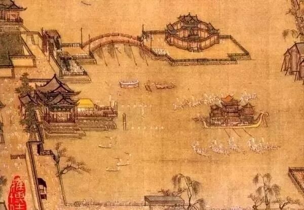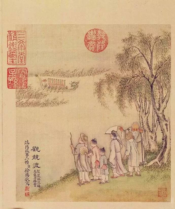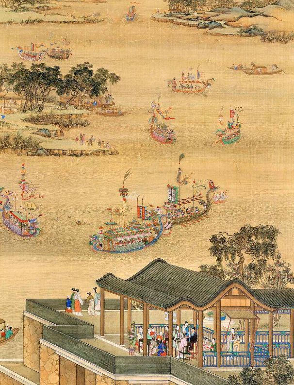 清乾隆宫廷画师徐扬绘,端阳故事八帧之一《观競渡》,此图册构图严谨精妙,人物造型秀逸生动,线条遒劲流畅,色彩明丽典雅,显示出作者较强的写实功底和乾隆朝宫廷绘画工整清丽的笔墨特点。