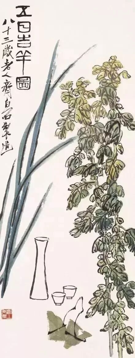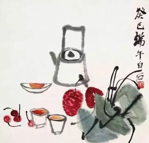 此幅端午图作于1953年,已是白石老人最晚年之作。雄黄酒、咸鸭蛋、粽子、荔枝、樱桃,都是端午节应景之物,白石老人以少胜多,以寥寥几笔将之描绘得淋漓尽致,让人有酒温果鲜之感。此等形象,在前人画作中极其少见,他们代表了与普通人同乐同忧的东西,蕴涵着朴素的思想感情。