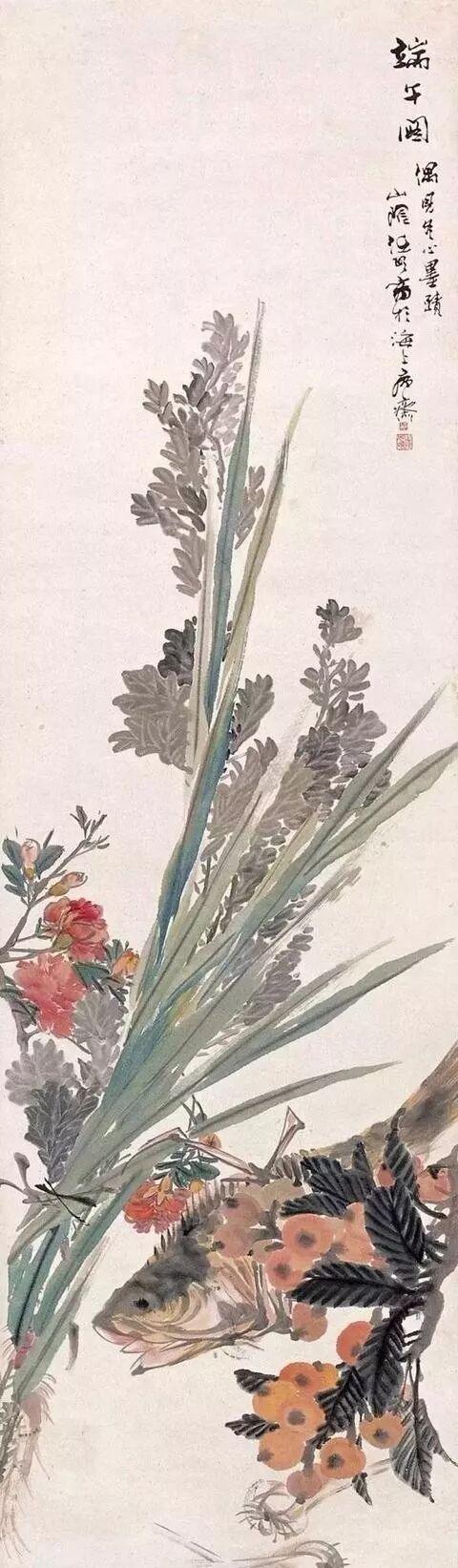 任伯年的《端午图》素朴清雅,以直立的艾草、菖蒲、蜀葵为主要表现对象,以地面上摆放的枇杷、蒜头为辅。寥寥几笔,韵味十足,似乎可见作者饮黄酒小酌的悠闲场景。端午节吃黄鱼是江浙一带的风俗,任伯年小酌的时候自然忘不了这一点。