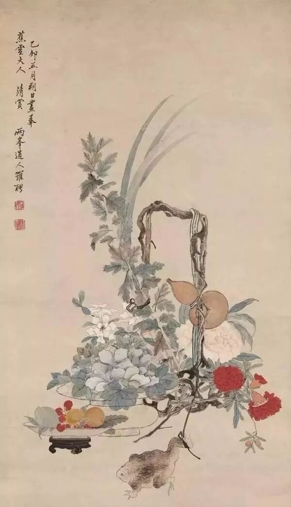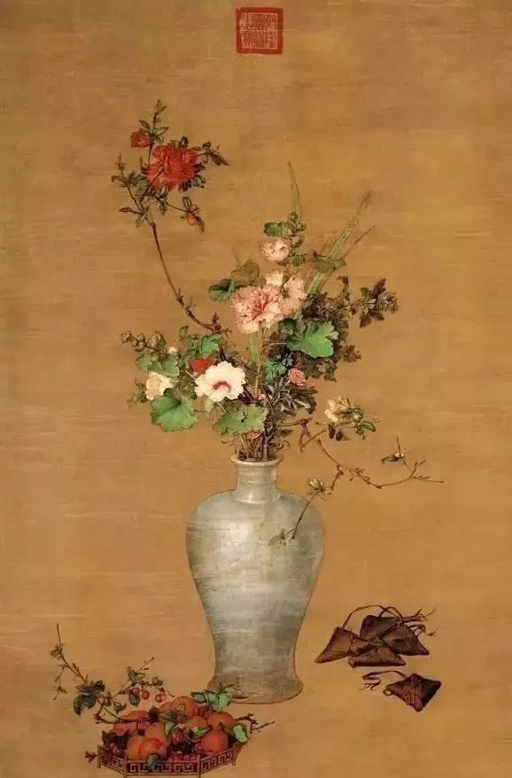 这是一幅近似于欧洲静物画的作品,青瓷瓶内插着蒲草叶、石榴花和蜀葵花,托盘里盛有李子和樱桃,几个粽子散落一旁。图中的粽子、蒲草等物暗示此画是为中国的传统节日——端午节而绘制的。宫中档案说此图“端阳节备用”,表明当时宫廷也有端午使用菖蒲、艾蒿的习俗。