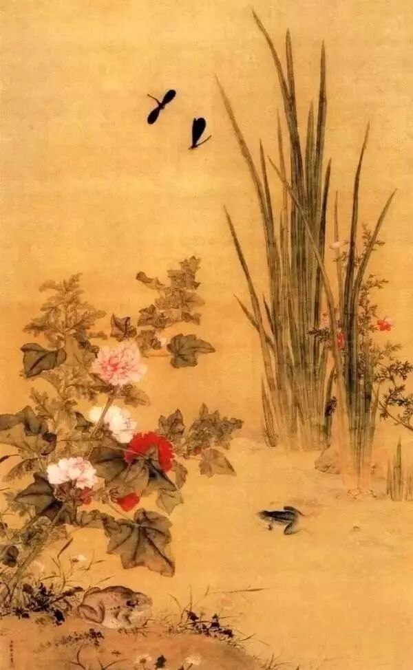 此图上方所绘乃两只豆娘,有人误认为是蜻蜓。古代端午节这天,江南一带的妇女有佩戴豆娘头饰的风俗。它是用丝绢等材料做成仙、佛、虫、鱼、百兽之形,或八宝群花之类,固定在金银丝或铜丝金箔支架上,插于妇女发髻上。