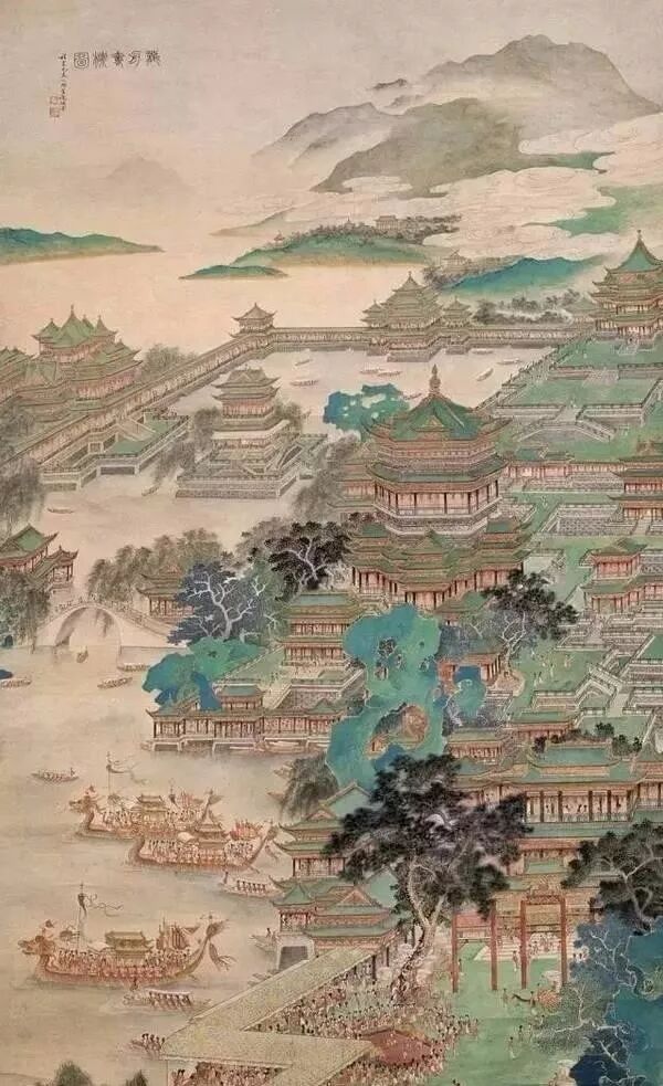 池岸四周桃红柳绿,间有凉亭,船坞,殿阁。水中龙船屑楼高阁,人物活动于楼内外;龙船两侧各有小龙舟五艘,每艘约有十人并排划桨,船头一人持旗;另有数只维游其间。书面左,下两侧的苑墙内外,人群熙来攘往。