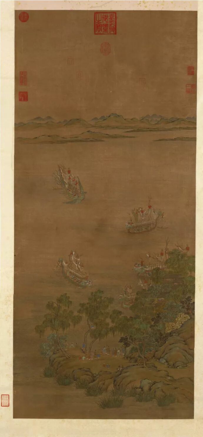 此图描绘的情景正是端午时节,中国南方地区的湖区景象。画面采用马远一角式构图,观看赛龙舟的老少人等集中在画面右下角的岸边,掩映于湖光树石之间,亦有人骑于树干枝头,以便获取更好的观赛角度。而画面大量的留白则形成了烟波浩渺的湖面,湖上四只龙舟、一只凤舟正在挥桨竞渡。远山若隐若现。整幅画面精致工丽而不失活泼,为风俗画的佳作。