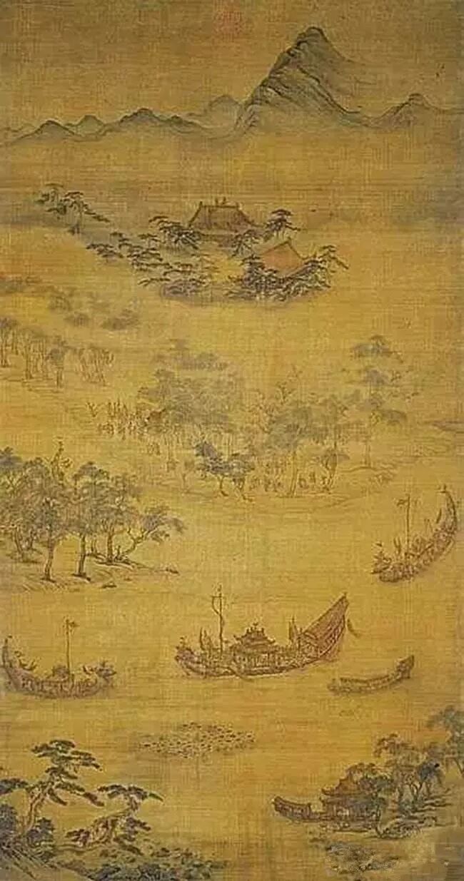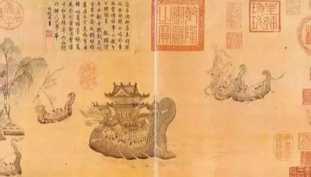 此图描绘北宋京城汴京(今开封市)金明池水戏争标的场面。画面苑墙围绕,池中筑十字平台,台上建军圆形殿宇,有拱桥通达左岸。左岸建有彩楼,水殿,下端牌楼上额书“琼林苑”三字。