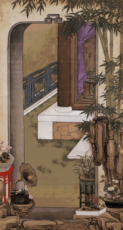 这幅画仅透过二分之一的圆窗来刻画繁复的景致,因为画面采取了西洋画的焦点透视法,将远、中、近三景安排得有条不紊,从而扩展了画面空间的纵深感,,得意韵悠长。