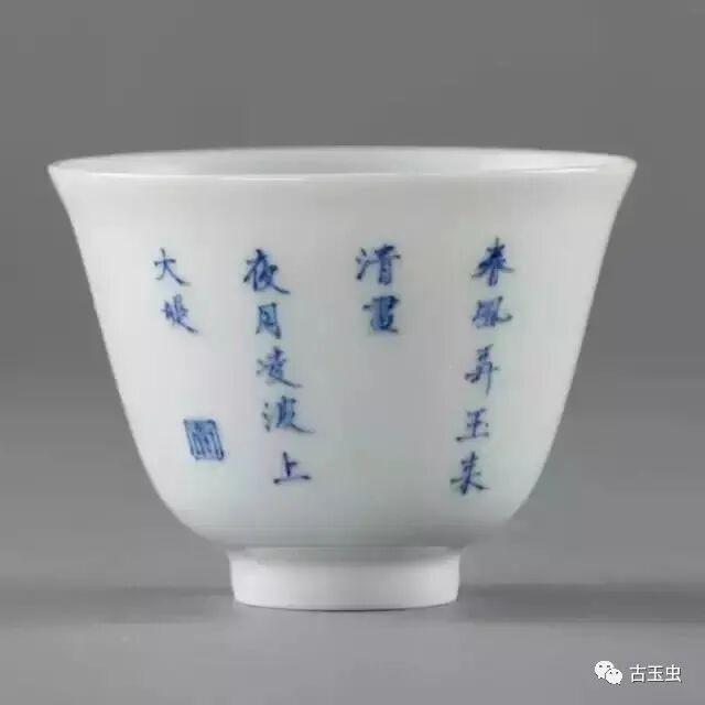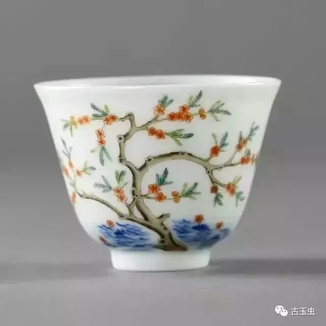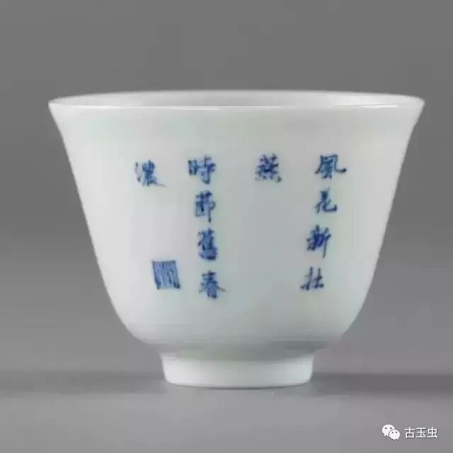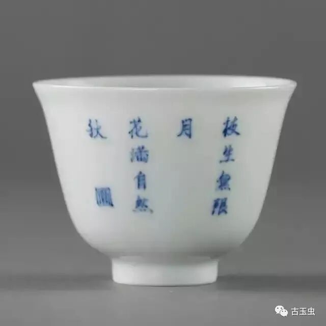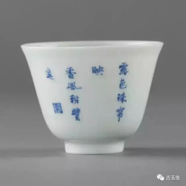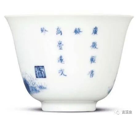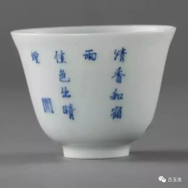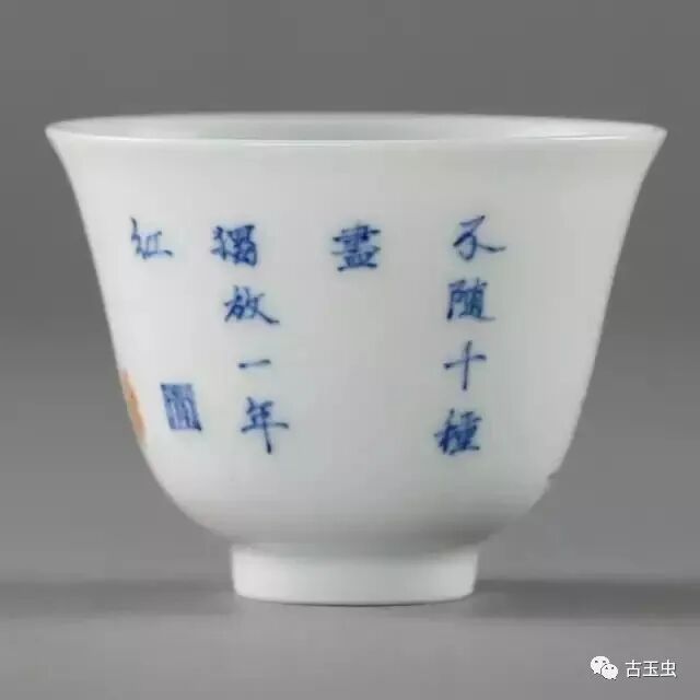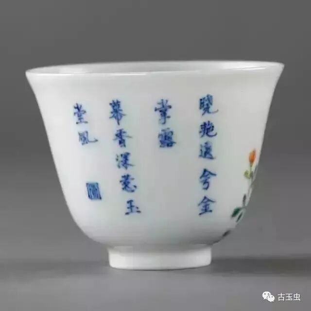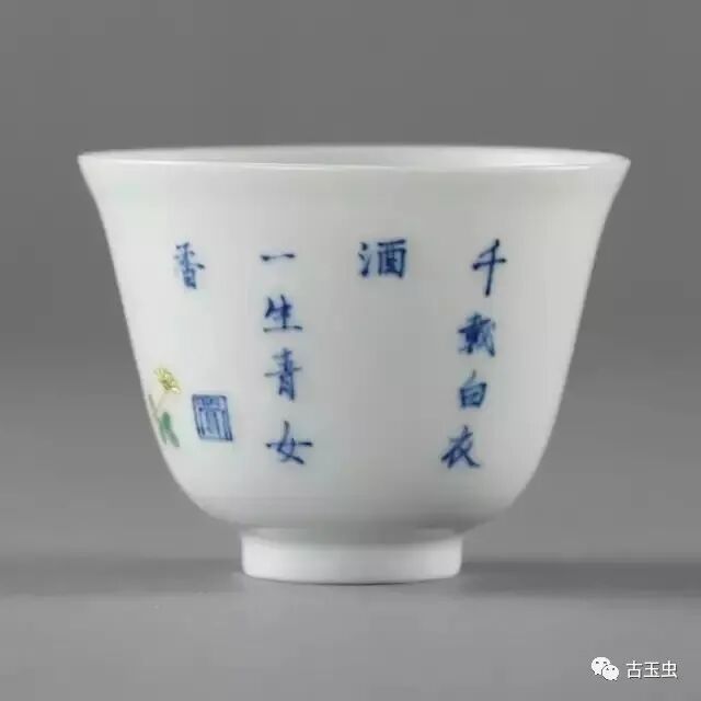 清康熙十二月令花卉纹杯做工精巧绝伦,造型雅致秀美,胎釉莹润,花卉纹饰清新淡雅,配以古代诗文和钤印。