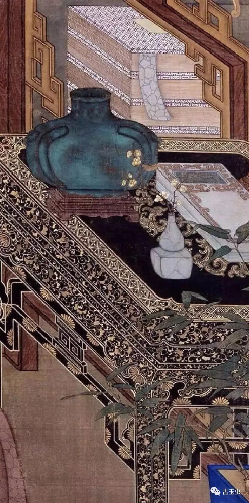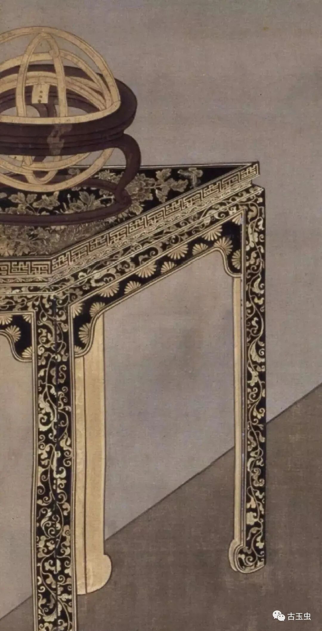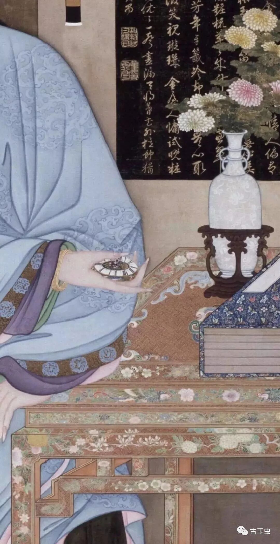 不远处几案上的西洋天文仪器与女子手中的珐琅表,表明西洋物件已渐为宫中时尚。