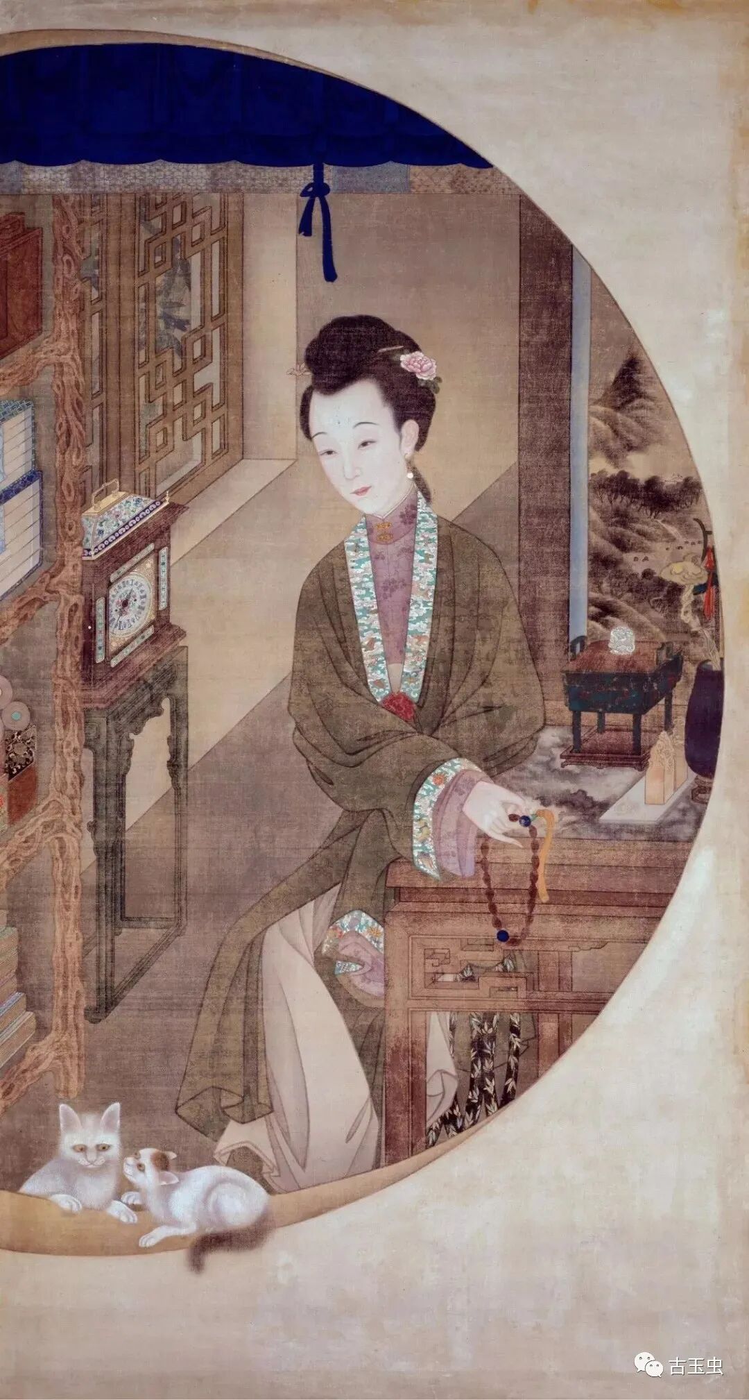 在捻珠观猫图中,美人于圆窗前端坐,轻倚桌案,一手闲雅地捻着念珠,正观赏两只嬉戏顽皮的猫咪。