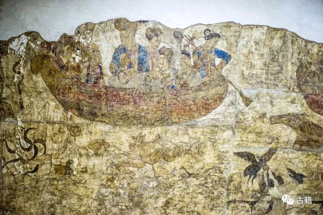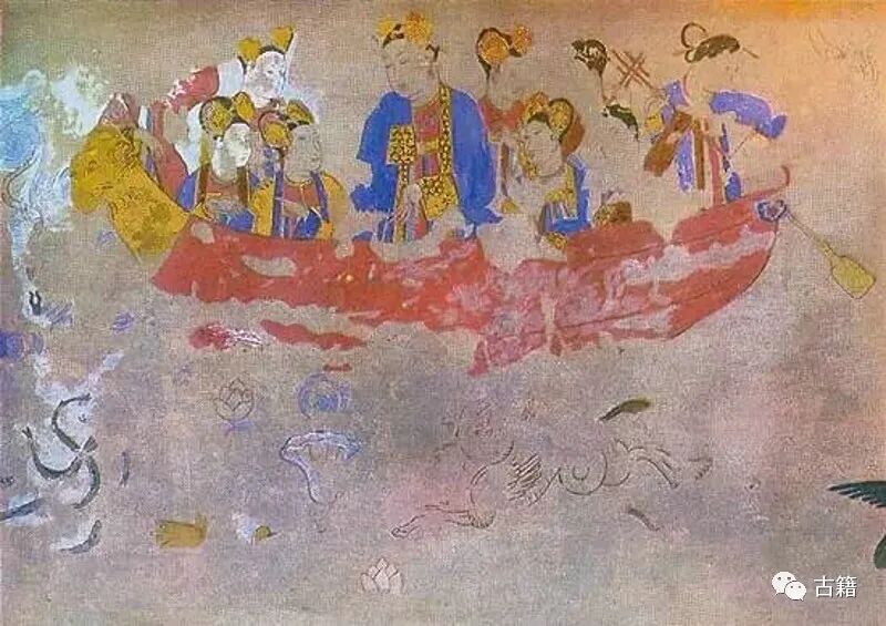 在一湖池水之上,有两条船,其中一条大船上有九位女子在泛舟。中间一位体貌格外高大肥胖(这是当时的画法,如南墙壁画里撒马尔罕新年祭祀,国王骑马出行,其尺寸之大格外引人注目;再如阎立本《步辇图》中的唐太宗,其体格也格外高大。康马泰认为这是粟特艺术的特征之一),身穿宝蓝色外衣,据马尔夏克教授考证,她就是天后武则天。