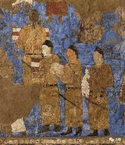 然而,洛阳的武则天平常穿着什么衣服呢?《旧唐书·志》第二十五记载:“皇后服有袆衣、鞠衣、钿钗礼衣三等。袆衣,首饰花十二树,并两博鬓,其衣以深青织成为之,文为翚翟之形。”从中可知,武则天端午节的衣服应该是深青色的。宝蓝色是中亚游牧民族王后独享的色彩,高雅尊贵。宝蓝色与青金石有密切的关系,青金石为中亚今阿富汗一带所出产。撒马尔罕古城大使厅的整个背景便是宝蓝色的。北壁的壁画中,武则天的宝蓝色外衣,毋庸置疑,是粟特画家将康国王后的外服比附于武则天。