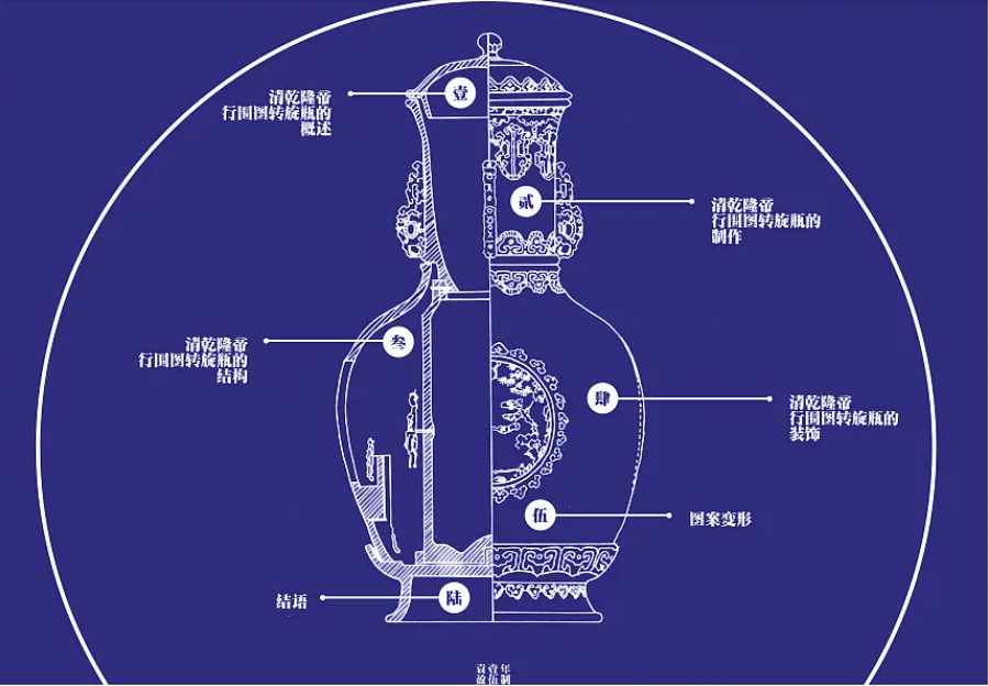 清乾隆帝行围图转旋瓶由盖、外瓶、内胆、夹层和底盘等六部分装配而成,装饰分外观装饰与主题纹饰两部分。乾隆帝行围图的人物、景致皆按透视比例绘(制)而成。