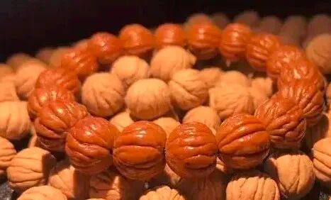 猴头核桃一般是打眼穿成手串,或雕刻盘玩。但是,这两年商家找到了新玩法:把表面纹理去掉,车成各种造型的光珠。
