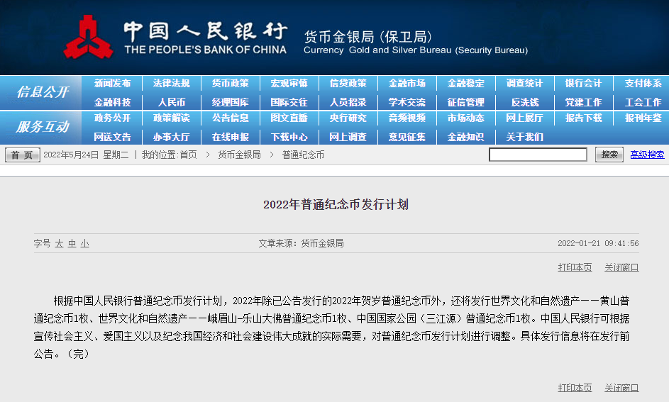 根据央行2022年普通纪念币发行计划,今年会把双遗系列的后两枚纪念币,黄山纪念币和峨眉山-乐山大佛纪念币发行完毕。