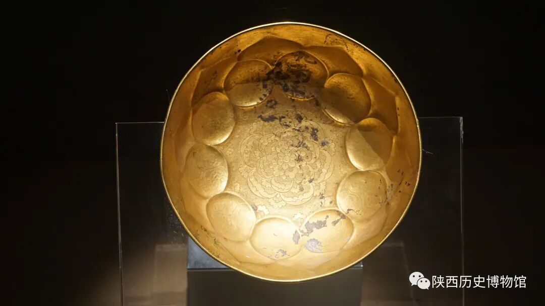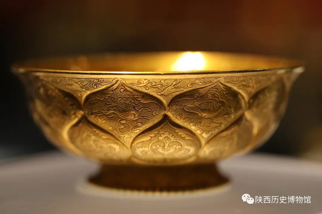 碗是唐代最基本的饮食器皿,用来盛食、饮酒、服药,何家村遗宝中总共有金银碗60件,从造型上看,有圜底的,有带圈足的,有弧腹的,有折腹的,有敞口的,有带盖的;体量也有大有小,说明有着不同的用途:或作饮器,或作食器,或作容器;从装饰上看,有的通体錾刻,形成繁复细密的满地装,有的仅在局部装饰,形成突出重点的单点装,有的则通体光素无华,尽显简约之风。金银碗中,经典之作有: