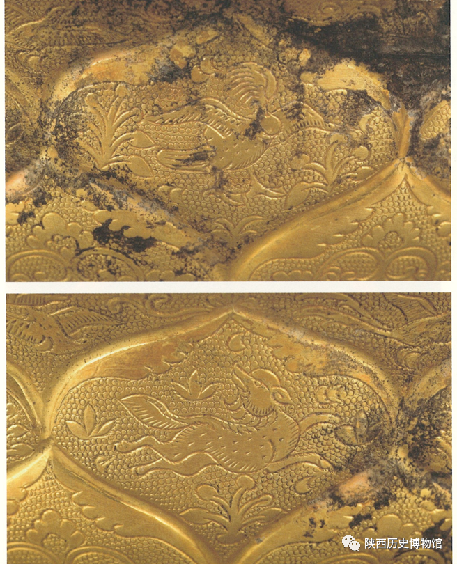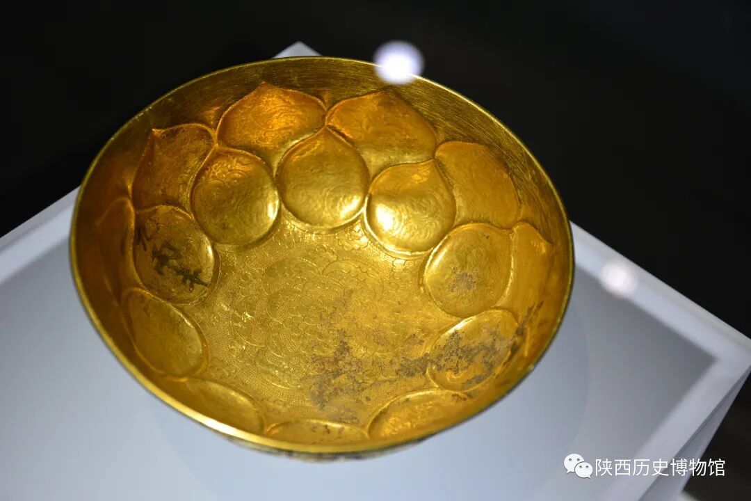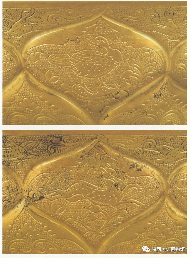 金碗的装饰主次分明,动静有序,成功地将蓬勃向上的时代精神与兴旺和谐的民族审美情趣融合在一起,是最为精湛华美、最具盛唐气韵的金质器皿,被国家文物局确定为国宝级文物。因为是手工制作,2件金碗虽属“一式两份”的对器,但重量有细微的差异,唐人墨书1件为“九两半”,1件为“九两三”,称重却仅相差1克,似乎当时对重要金器的管理使用更为精准的衡器;两碗局部装饰上也有不同,外底中心虽各为一只鸳鸯,但呈回首相对状,形成有趣的互动组合。