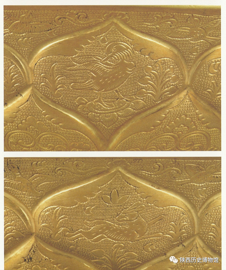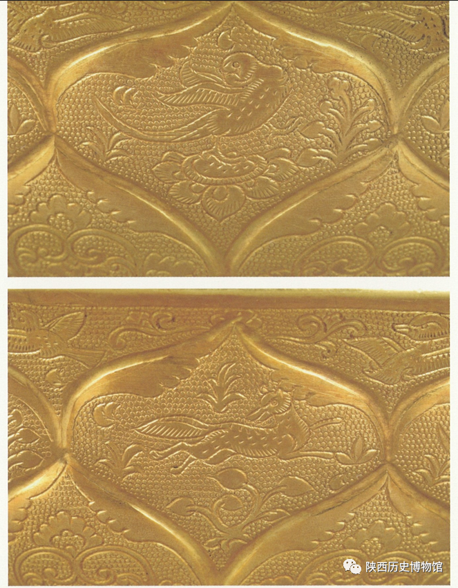 2件鸳鸯莲瓣纹金碗,造型、规格一致,制作亦十分精细。金碗腹壁的双层凸瓣,在粟特金银器上常见,其渊源可能来自更遥远的希腊罗马。装饰上,金碗的内底平錾团花,外壁压出交错排列的双层莲瓣,每层10瓣,上层每瓣中心錾刻一只飞禽或走兽作为主题纹饰,环绕以花草;下层每瓣中心均为忍冬纹。莲瓣之上、口沿外壁一周填充一组飞禽与如意云纹,莲瓣之下、圈足外壁一周则以方胜纹装饰。碗底外壁中心是一只飞翔于花草之中的鸳鸯。主纹之下,全部以鱼子纹填底。