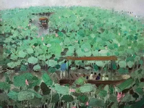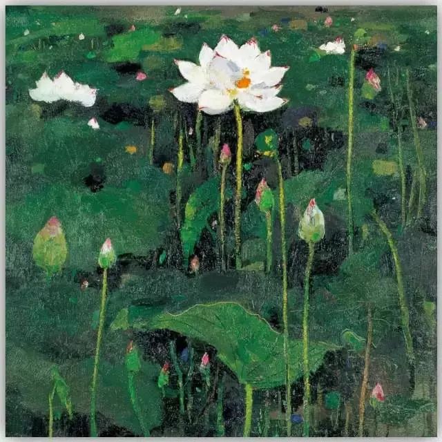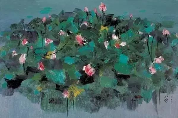 关于荷花的作品,吴冠中大概大大小小画了二十多幅,为什么喜欢画荷花呢?吴冠中先生曾说:“中国传统绘画中的荷花卷轴汗牛充栋,但那些程式化了的荷图并不令我激动。而荷塘中大块小块叶片之交错,曲线直线穿插之繁杂,连倒影也已被包围进叶丛中,难分水上水下,似乎我只是叶底的昆虫,迷途于花叶的迷宫。我作过不少残荷,着眼于线之曲折,倒影的荡漾,垂莲的点缀,这回彩绘浓妆,似乎想饱餐浓叶重彩的盛宴,愿读者有同样的好胃口。”