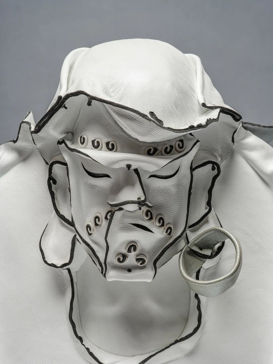 皮革这种有机物源自动物、特别是有血有肉的哺乳动物,也正是这种曾经拥有生命的材料,它的原始感、生命感会让人产生一种贴近内心的的心理感受,让人有一种回望生命本体、追思生命意义的联想。所以说皮革这一材料很适合用来表现生命、死亡、灵魂、肉体、皮囊、轮回等一系列主题。