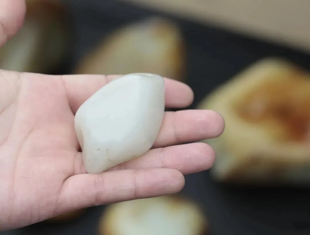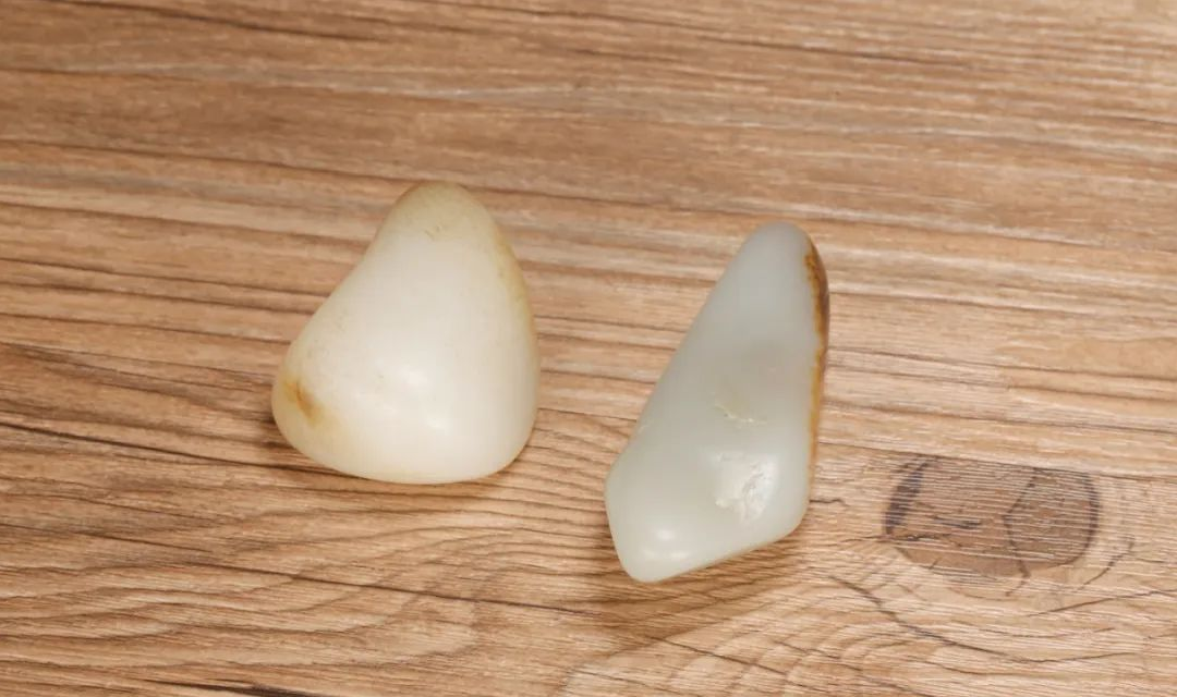 形状不仅仅是一个卖点,更有其他的一些不被人所熟知的作用。而在各种卖点当中,形状也是一个比较重要的点。有的料虽然不错,但因为太薄,或者天生异象,所以可以做的题材有限。而外形圆润饱满,可把玩可雕刻,用处就更多,价格自然相比而言高一些。有时候两块差不多的料,仅一个形状的差别,价值就能差出不少。除了一眼看见的卖点之外,对于玉雕师来说,形状很多时候决定了它可以做一件什么,也就是说决定了这块料的用途。一块大料,形状决定了它是做料还是玩料,需要切还是不要切。有些料子形状比较小,而且形状完整,那它就适合做玩料。块度很大,但完整度同样特别好,没什么大的绺裂瑕疵,那么这个料可能同样不太适合切。有些完整度特别好的大料,收藏原石,可能比切开它价值更高,所以很多特别好的大料没人舍得切。有些料子比较扁平,那么它就适合做牌子,有些料子把握起来很舒服,那么它就比较适合圆雕的手把件。有些料看起来个大,但不出活,怎么切都不出好的牌子或把件,那么它可能就只能车珠子了!形状是衡量价值的首要一步,先看这个料能做什么,再去评估它的价值。如果没法做活,那么这个料再好他们也不太喜欢。最明显的就是老熟。老熟其实有一部分就是从外形表现出来的。老熟料的外形可能并不是特别的圆,但它整体的感觉一定是很舒服的。从上面的图片,我们就可以感觉到它们形状的差距,一个看起来很舒服,一个看起来略有不成熟的地方。生的料子往往外形上没有那么圆润,可能这地方凸出一块,那个地方凹下去一些,从外形上就能感觉出它玉质欠缺的地方。外形也可以影响玉质,有些料子特别薄,那么这个料可能看起来就略水润一些,有些料子很饱满,那么它的糯性看起来就更好。