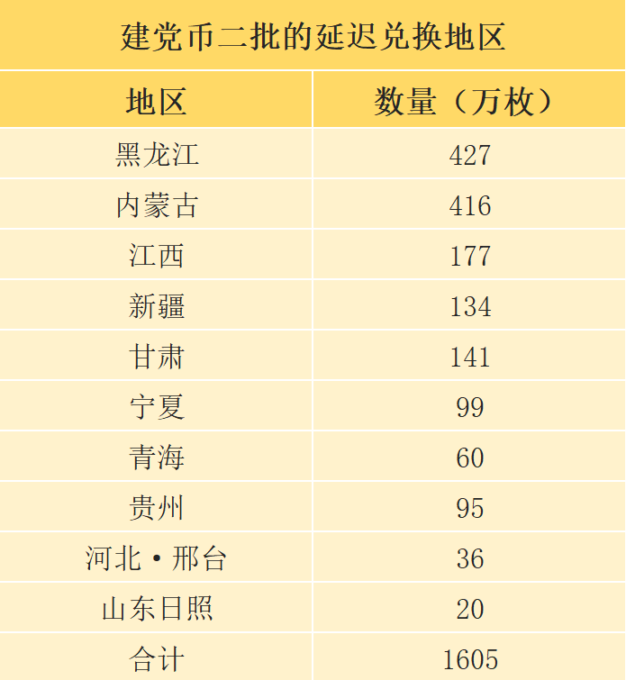 受到疫情影响,目前已经有10个地区公布了建党100周年纪念币二批兑换延迟的通知,合计有1605万枚将延迟兑换!