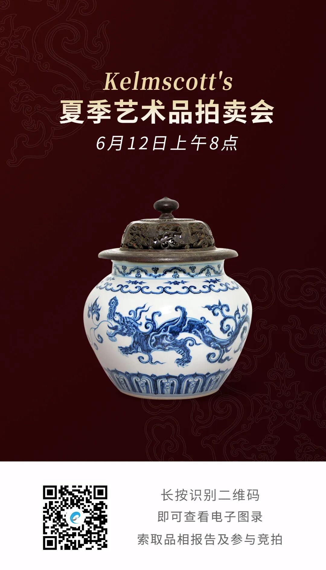 北京时间6月12日上午8点,Kelmscott's 将在德克萨斯州普莱诺举行『夏季艺术品拍卖会』,呈现近200件精美艺术品,瓷器数量尤丰,兼有玉器、鼻烟壶、织绣和西方装饰艺术。拍品主要来自美国本土各地的私人藏家与北德克萨斯州的遗产拍卖,价格亲民,起拍价多位于数百美元的区间内,极具捡漏空间。联拍在线将全程直播,并提供实时同步竞拍技术和服务支持。