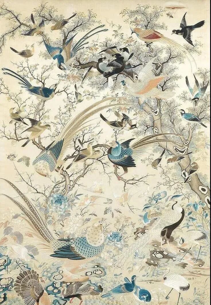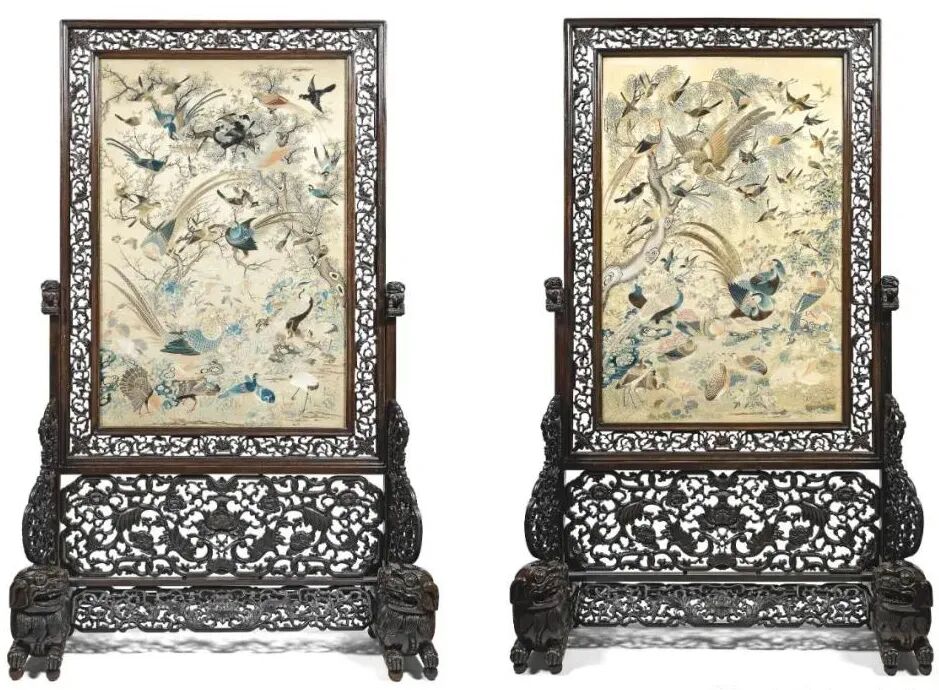 十九世纪 红木边框镶缎地粤绣「百鸟朝凤」图座屏一对(1.8-2.4万)