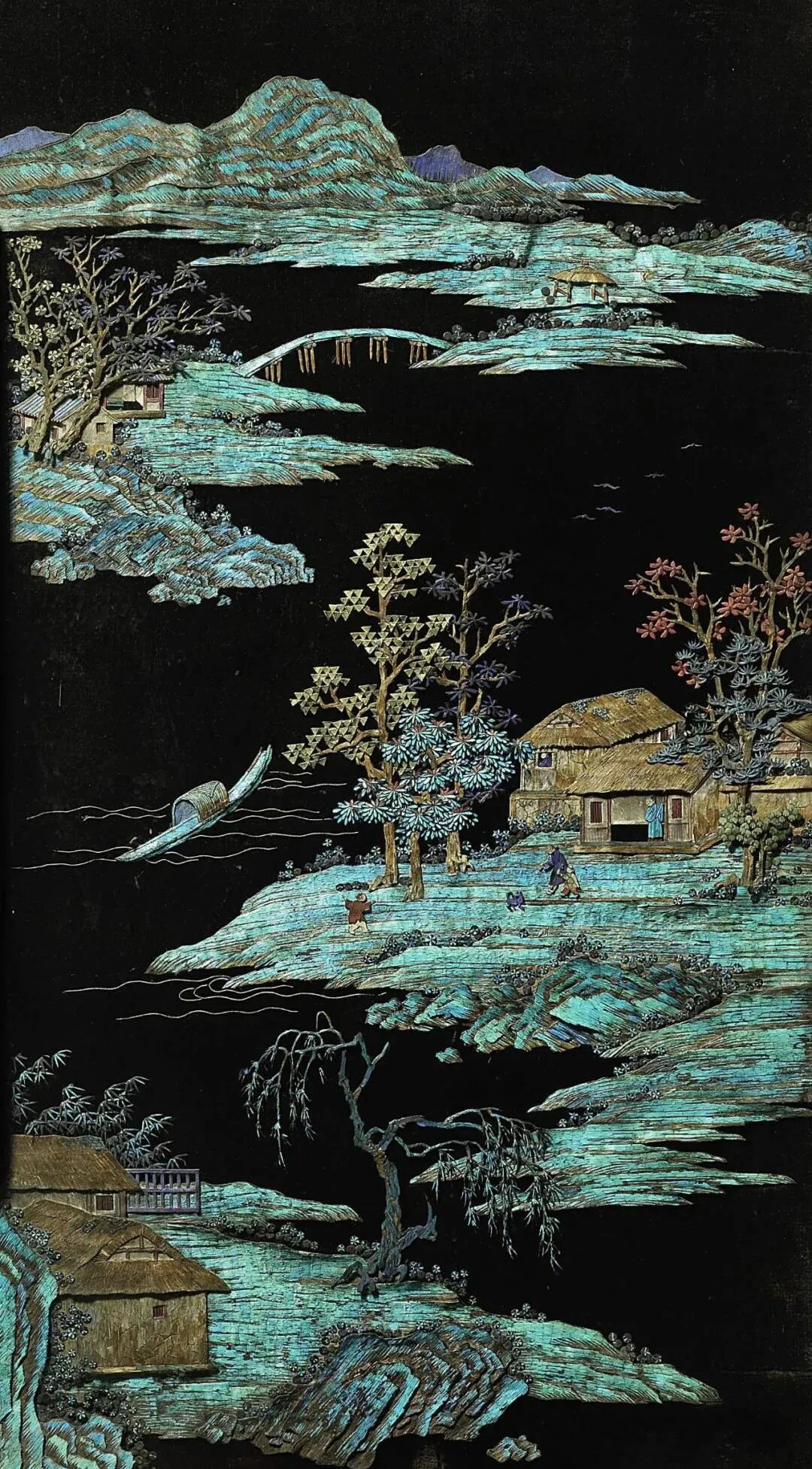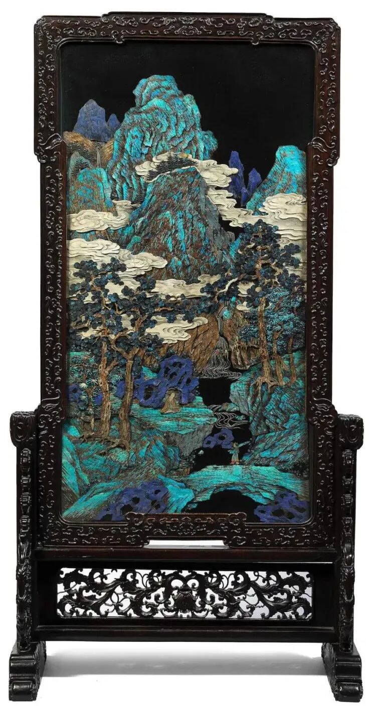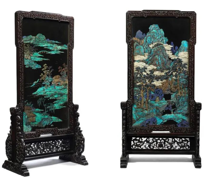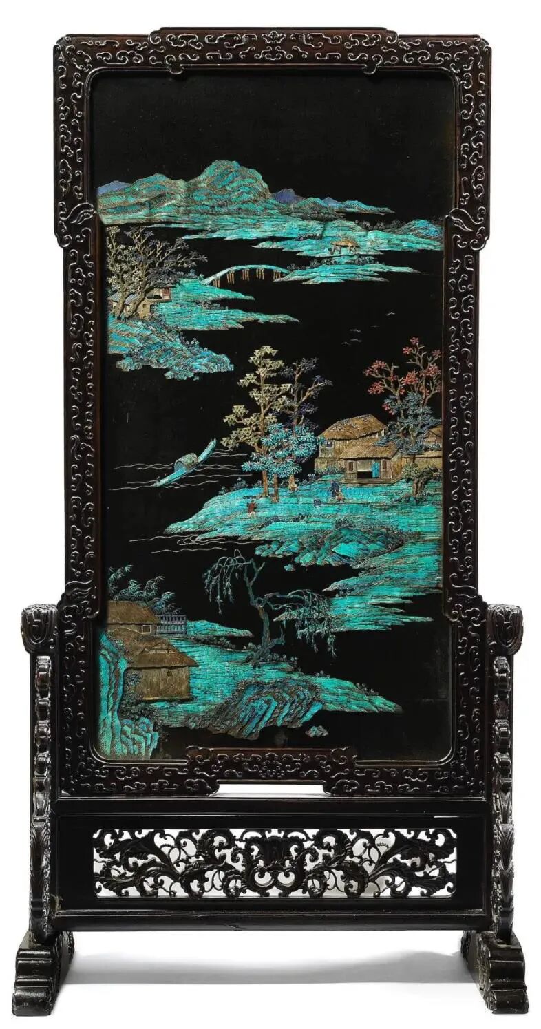 清乾隆 紫檀边座点翠山水人物图插屏一对(12-18万)