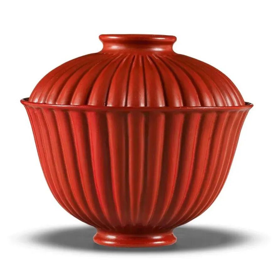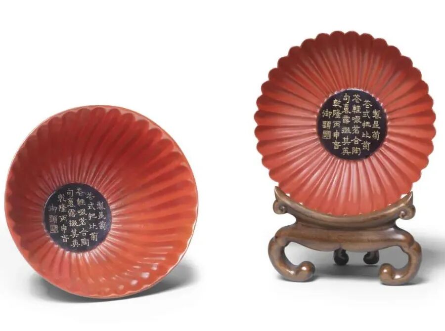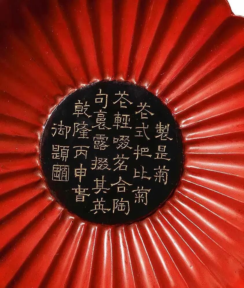 清乾隆四十一年 御制脱胎朱漆御题诗菊瓣式盖碗(10-15万)