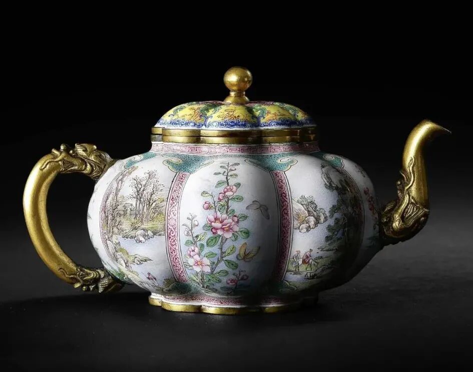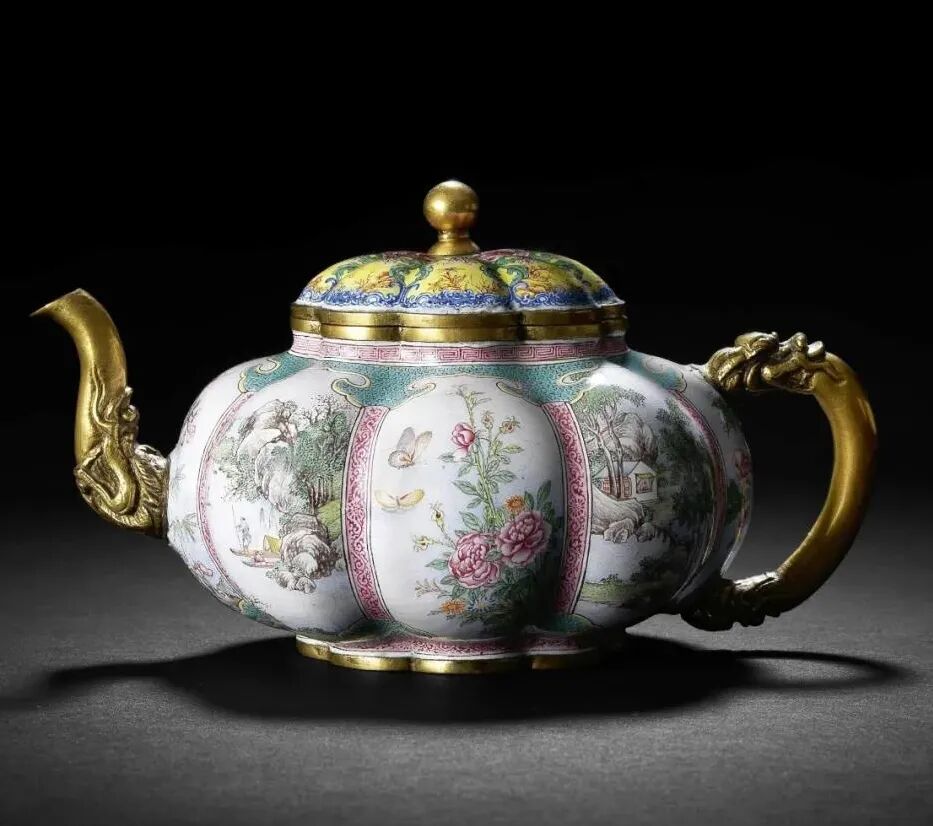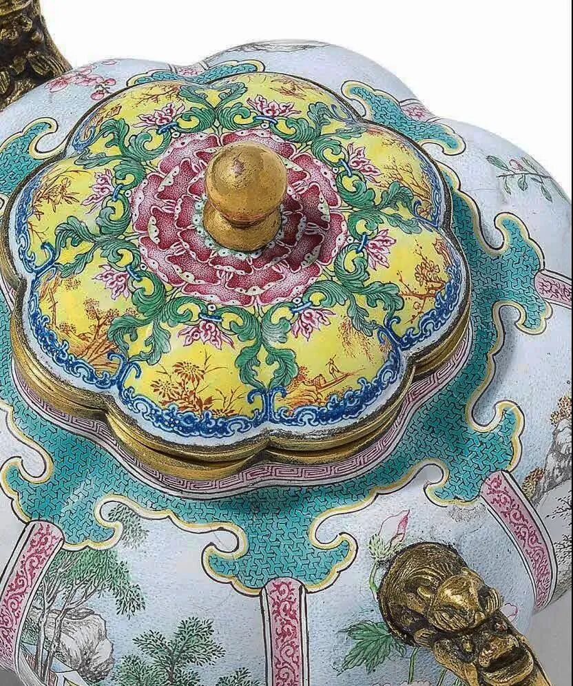 铜胎画珐琅于康熙晚期在清宫造办处烧制成功,作为当时的高科技产品,仅供皇家专用,清宫造办处画珐琅只在康雍乾三朝制作,大部分作品如今收藏在两岸故宫。与邦瀚斯这件铜胎画珐琅瓜瓣壶相似者,已知仅两件,分别藏于台北故宫与美国纳尔逊·阿特金斯艺术博物馆。