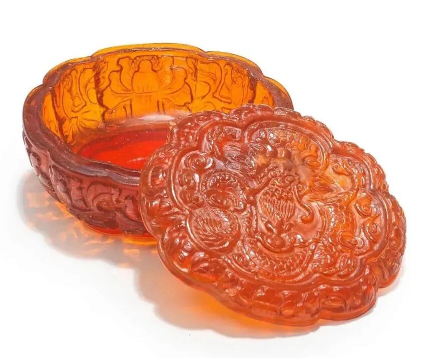 十八世纪 琥珀雕龙纹海棠形盖盒