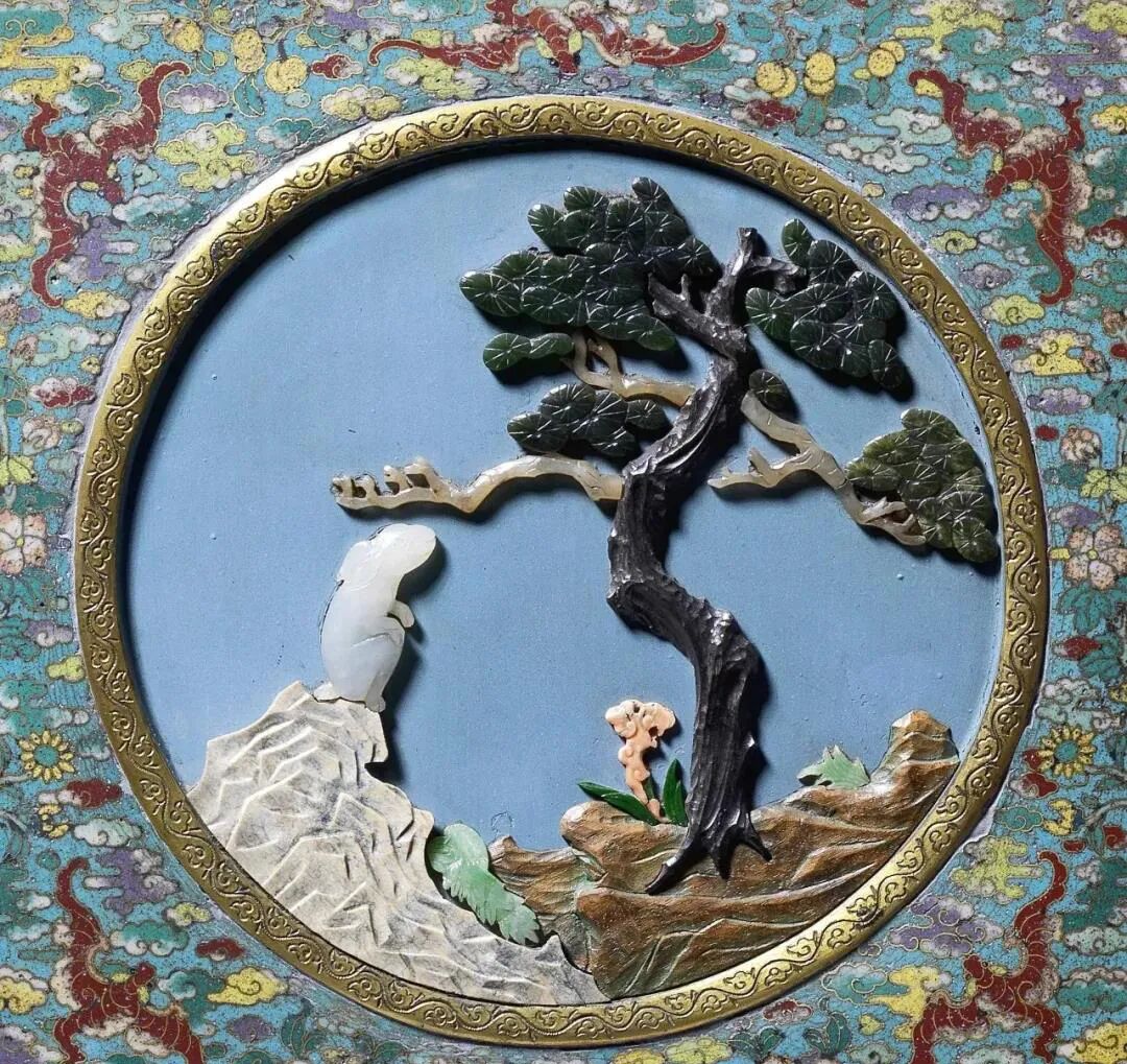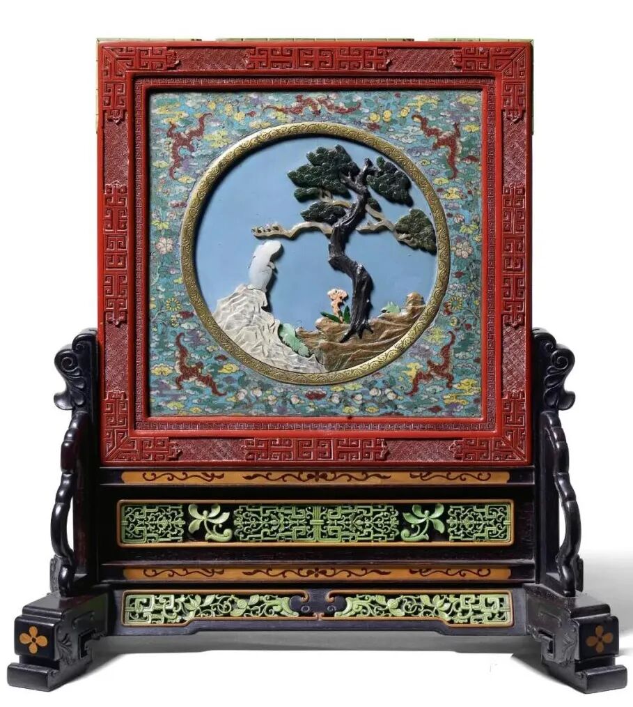 清乾隆 紫檀嵌象牙座剔红框铜胎掐丝珐琅镶漆地嵌宝「蟾宫月兔图」插屏(7-12万)