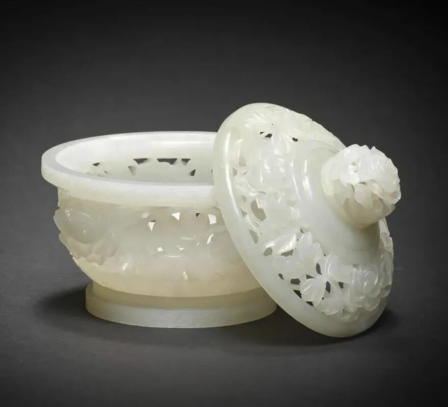 清乾隆 白玉镂雕牡丹纹带盖花熏(1.5-2万)