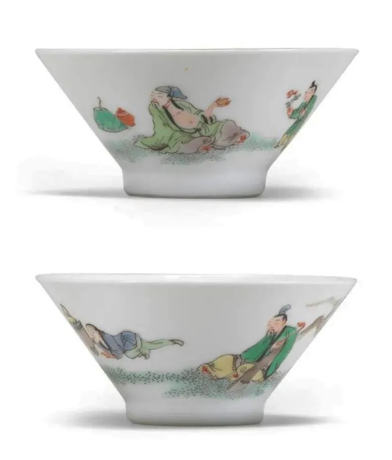 清康熙/雍正早期 五彩太白醉饮图笠式杯一对(2-3万)