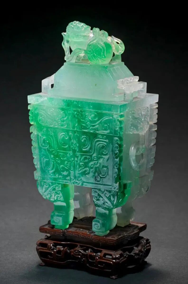 清晚期 翡翠饕餮纹狮钮活环耳方鼎