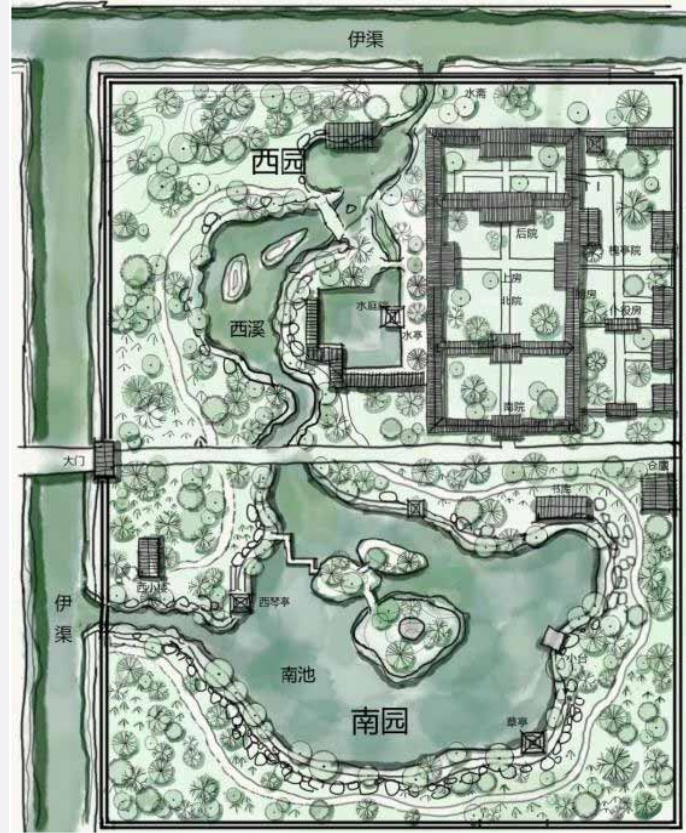 白居易住宅复原(图片来源于《无遗存的洛阳历史名园虚拟可视技术保护研究》)