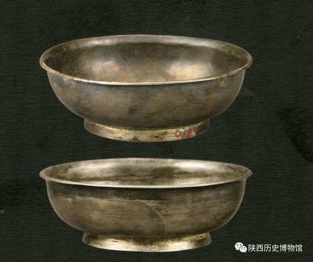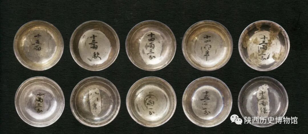 碗的大小亦有所不同,许多碗在内底处用墨书标出重量,如银碗,碗内底墨书“十五两半强”,银碗,碗内底墨书“十三两软”等等。银碗,碗内底墨书“七两三分”,是银碗中重量最轻者。这些标重题记应该与其使用时的管理有关,这也是目前为止唐代金银碗中标重数量最多、最为集中的一次发现。