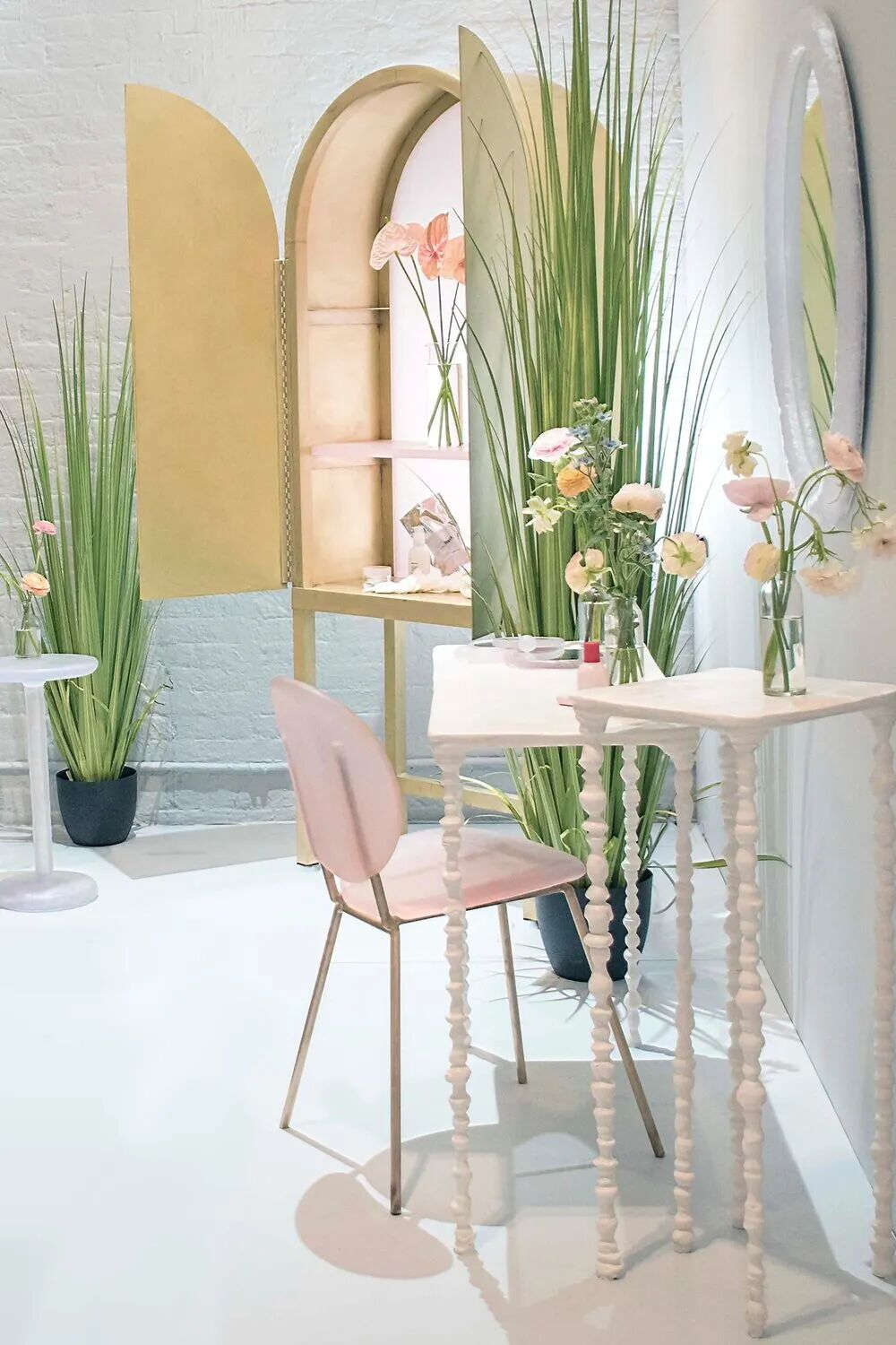 由“旋转石粉”制成的细长梳妆台和桌子——在特殊的车床上雕刻的残余石粉和使用光泽罐等复合材料作为基础材料制成的柔和半透明的镜子、椅子和衣橱。